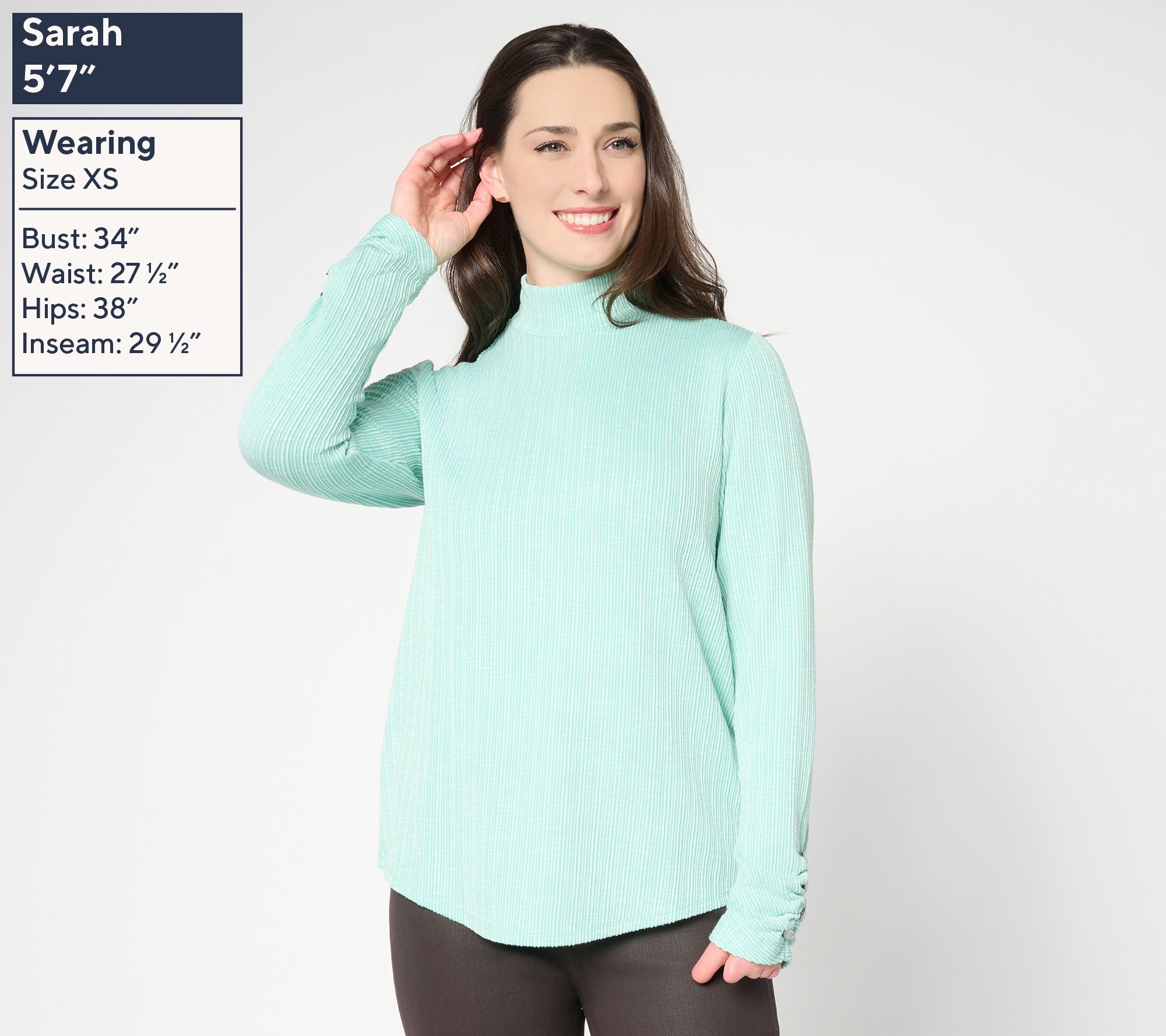 • Features: mock neck, long sleeves, pullover style, hidden elastic ruching at side sleeve openings, curved shirttail hem