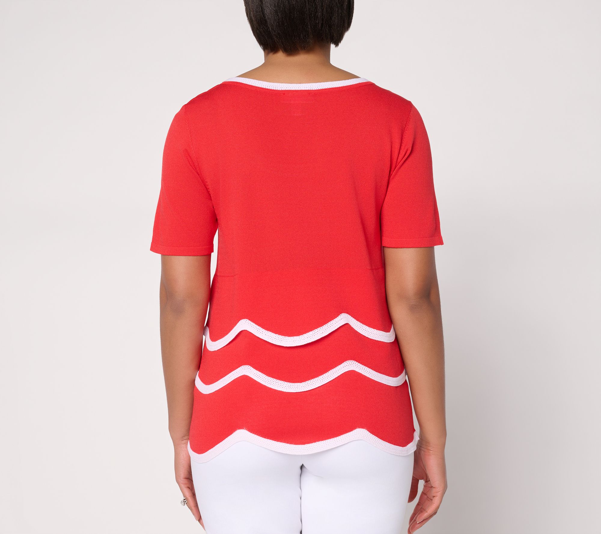 Three cheers for tiers! Shift your style for lunch with friends or dinner out with this tiered scoop-neck sweater, adding soft, scalloped edges to every move. Elbow-length sleeves bring coverage for transitional seasons, while three white-trimmed tiers create a flowy wave silhouette that has us thinking seaside thoughts. From Susan Graver.