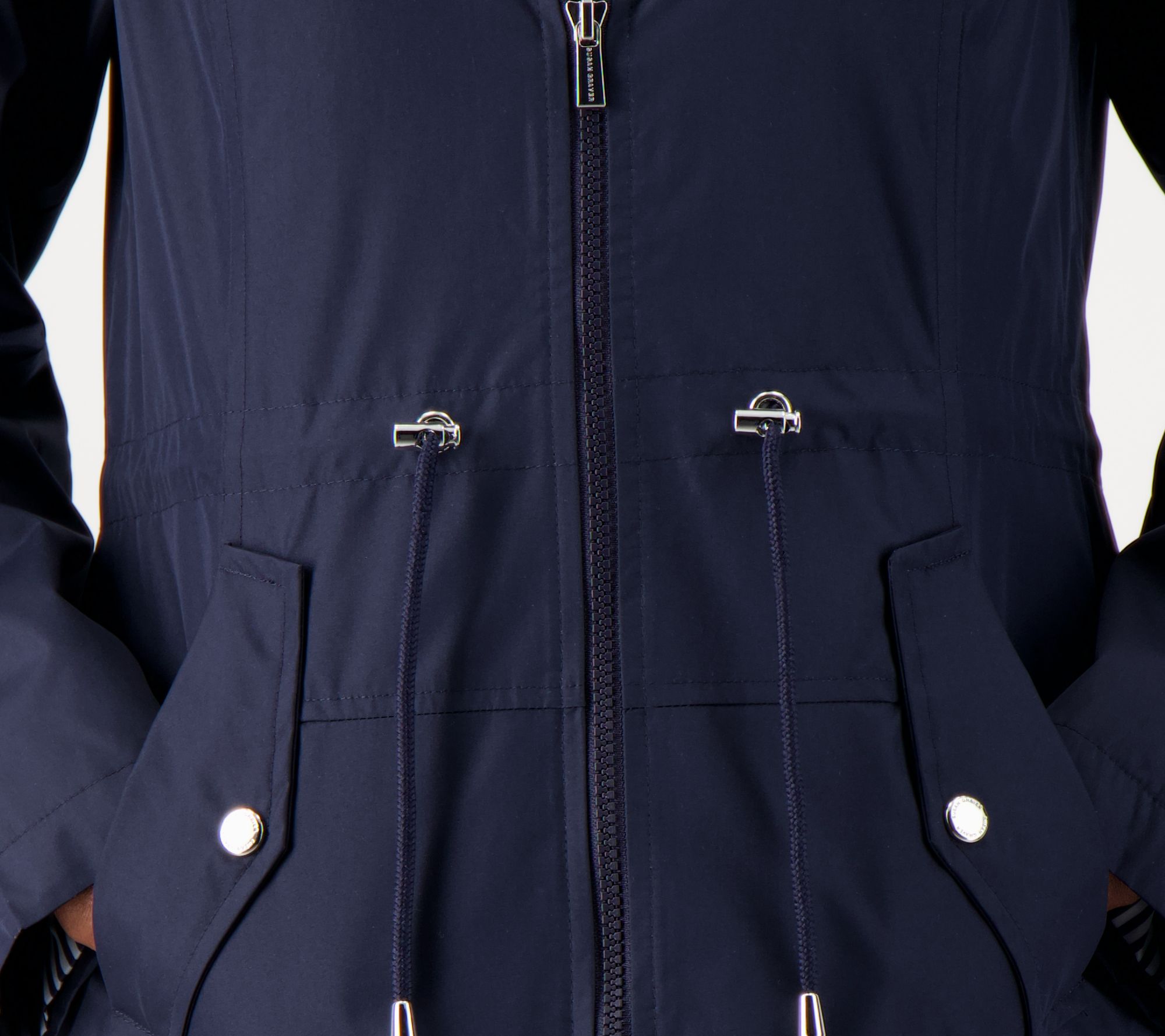 • Features: snap faux flap with seam pocket entry, anorak waist drawcord, detachable striped lined hood, eyelets and bell-end trims, roll-back snap tabs at cuffs