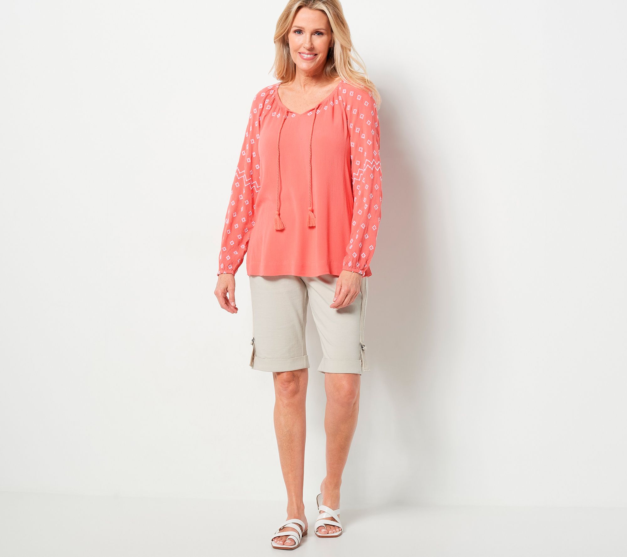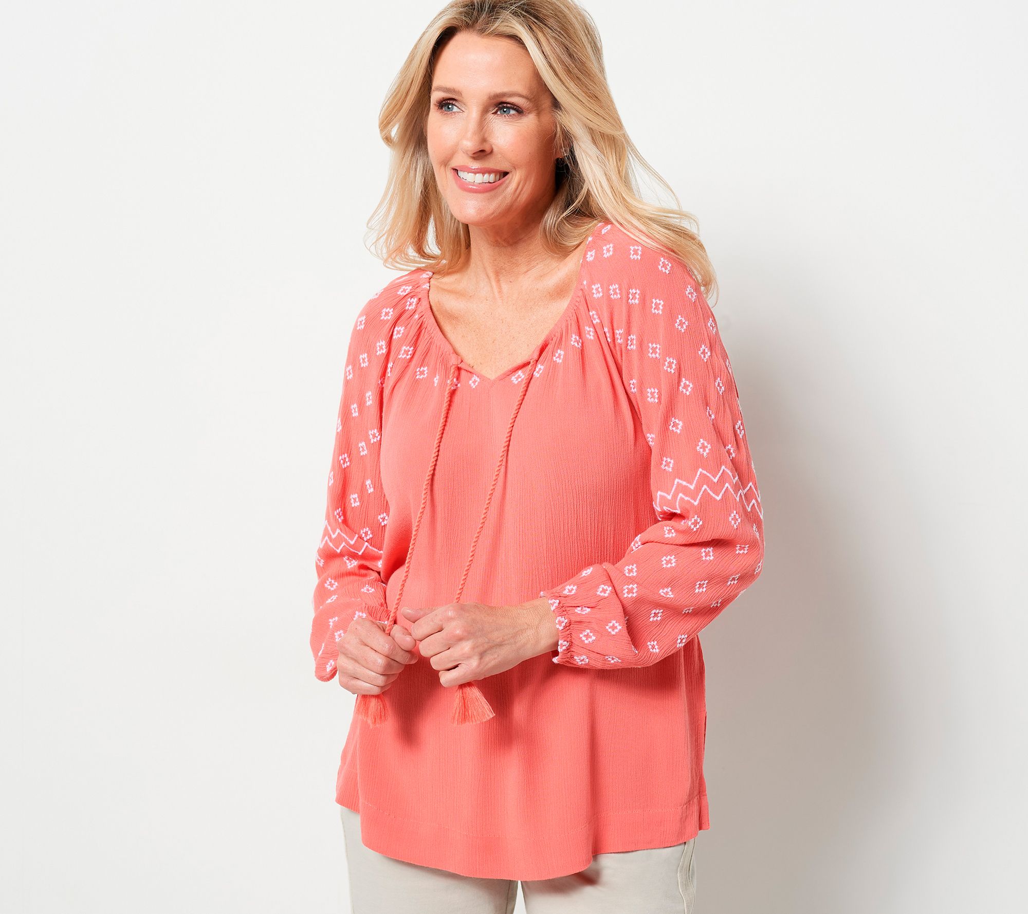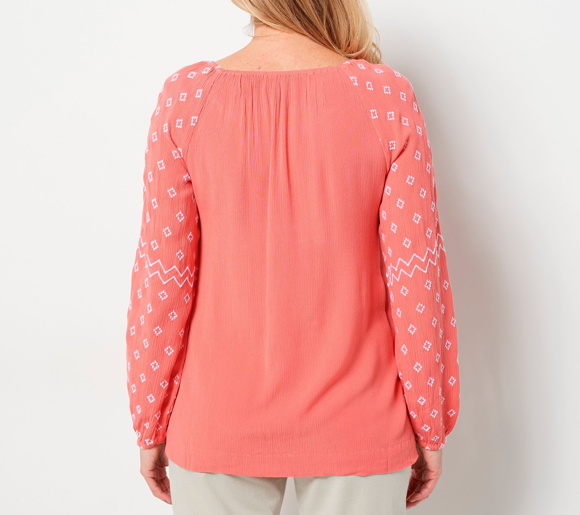 • Features: crinkled design, embroidered, long raglan sleeves with elastic cuff, scoop neckline, V-notch with self-ties and tassels, straight hem, side vents