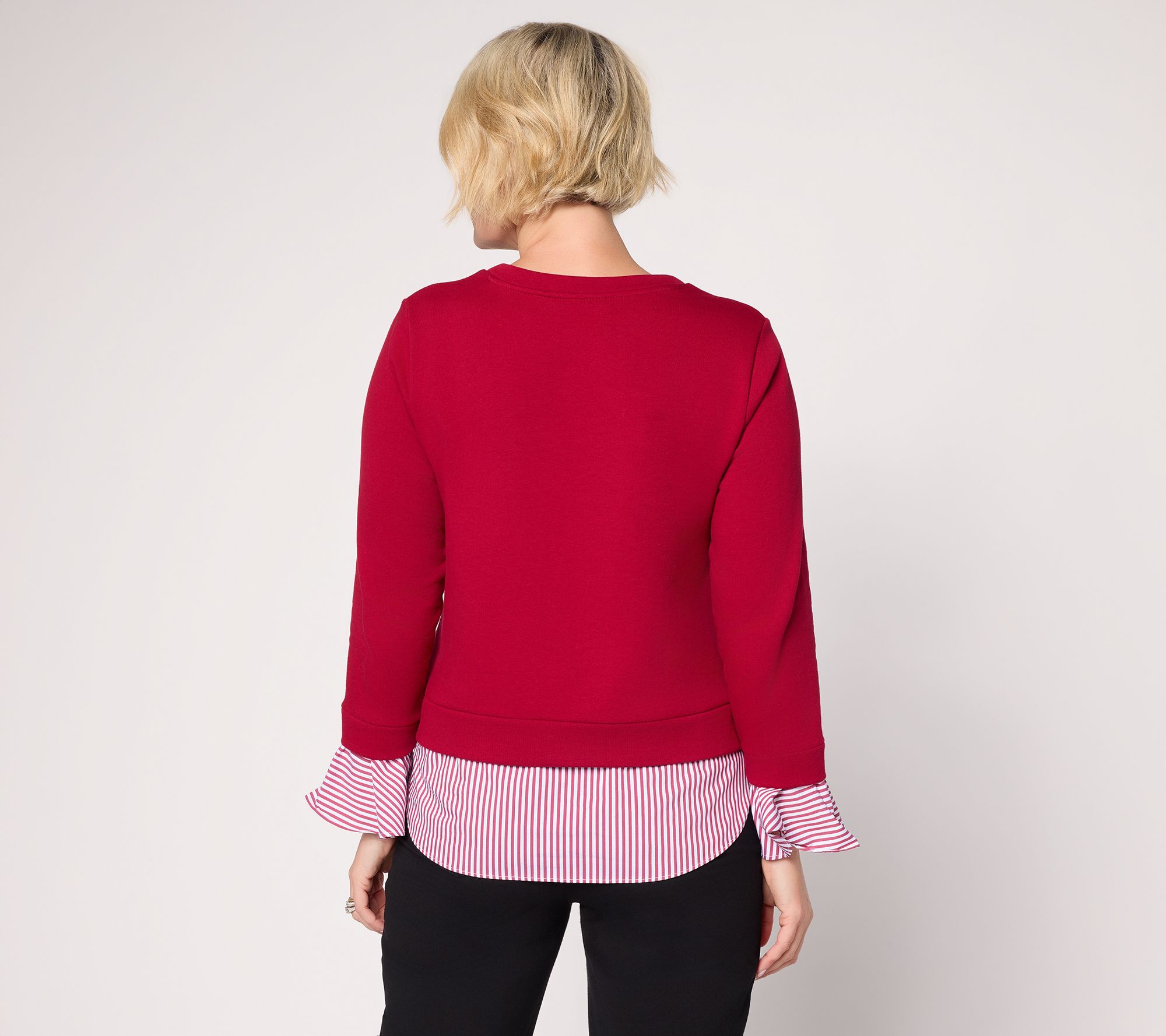 A fresh take on casual style -- this French terry top blends comfort and charm with its relaxed silhouette and playful woven stripe details at the cuffs and shirt-tail peplum hem. The crew neckline and long sleeves make it ideal for everything from busy mornings to relaxed weekends, offering effortless polish with everyday ease. From Susan Graver.