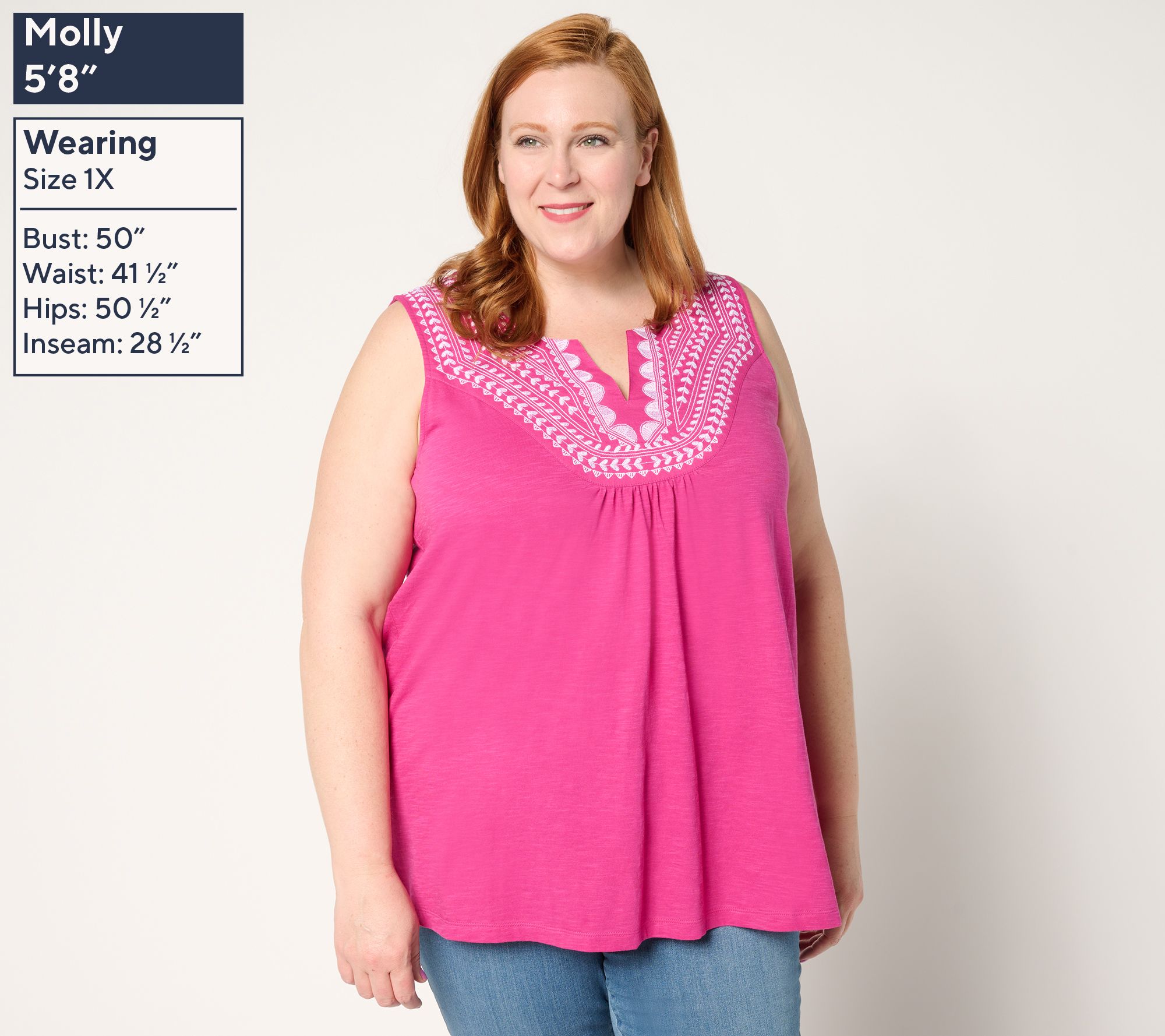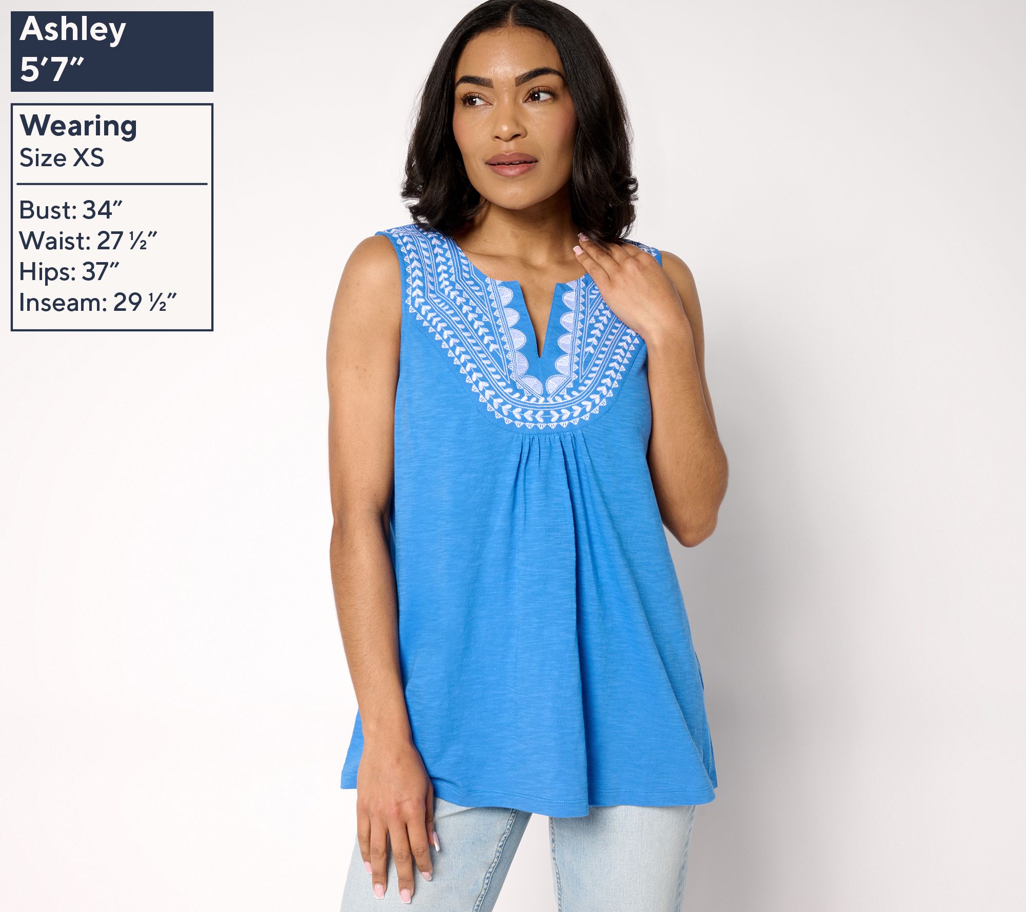 No jacket required. This sleeveless cotton tank feels substantial enough to star in its own sunny day matinee, thanks to textured fabrication, rich embroidery, and a flattering A-line shape. From Susan Graver.