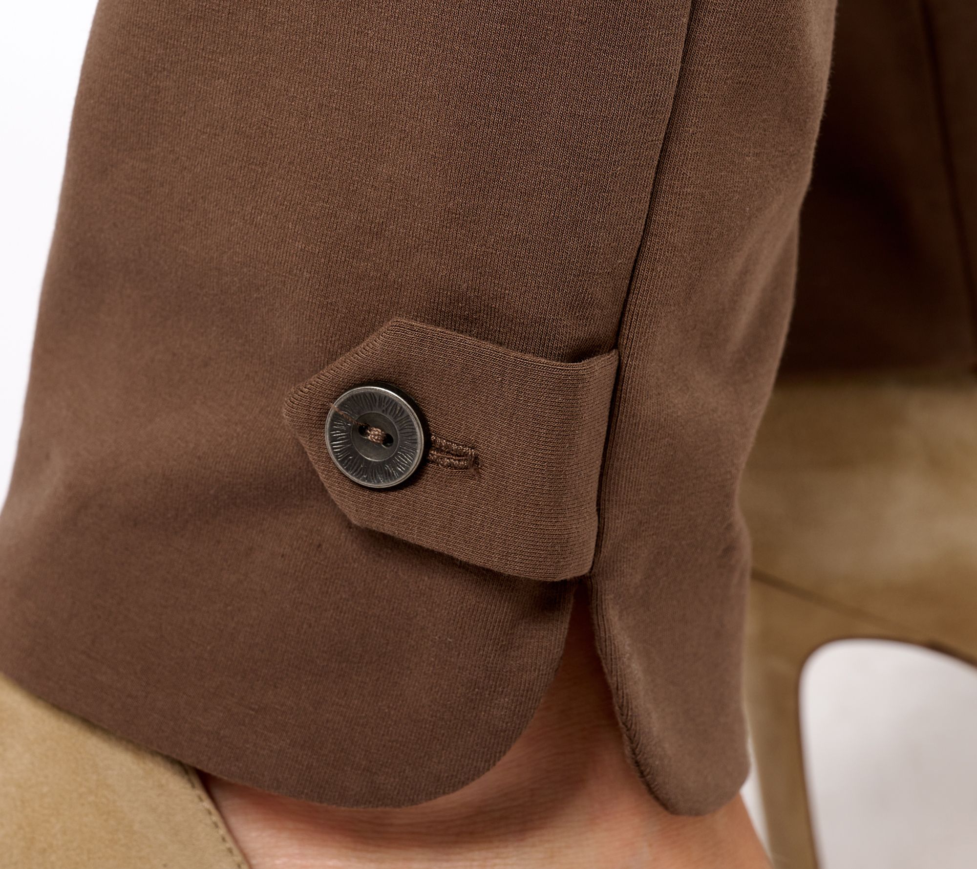 • Features: pull-on style, button and tab details at curved side vent leg openings, L-shaped pockets with rivets, faux fly