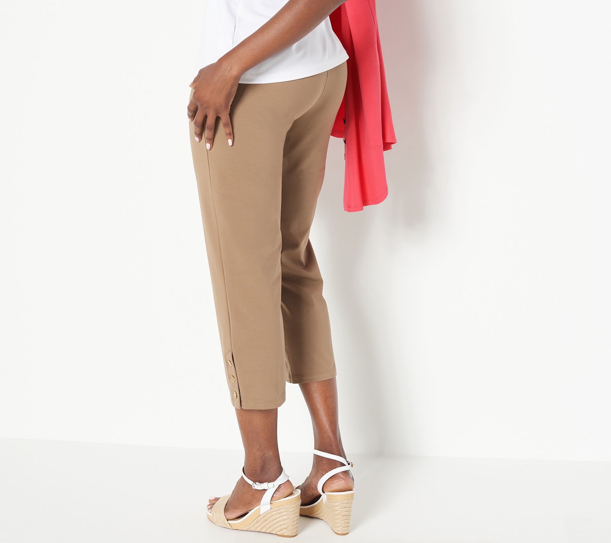 So chic, these premium stretch cropped pants offer a flattering fit with functional buttons at the hem, making them a mainstay in your warm-weather wardrobe. From Susan Graver.