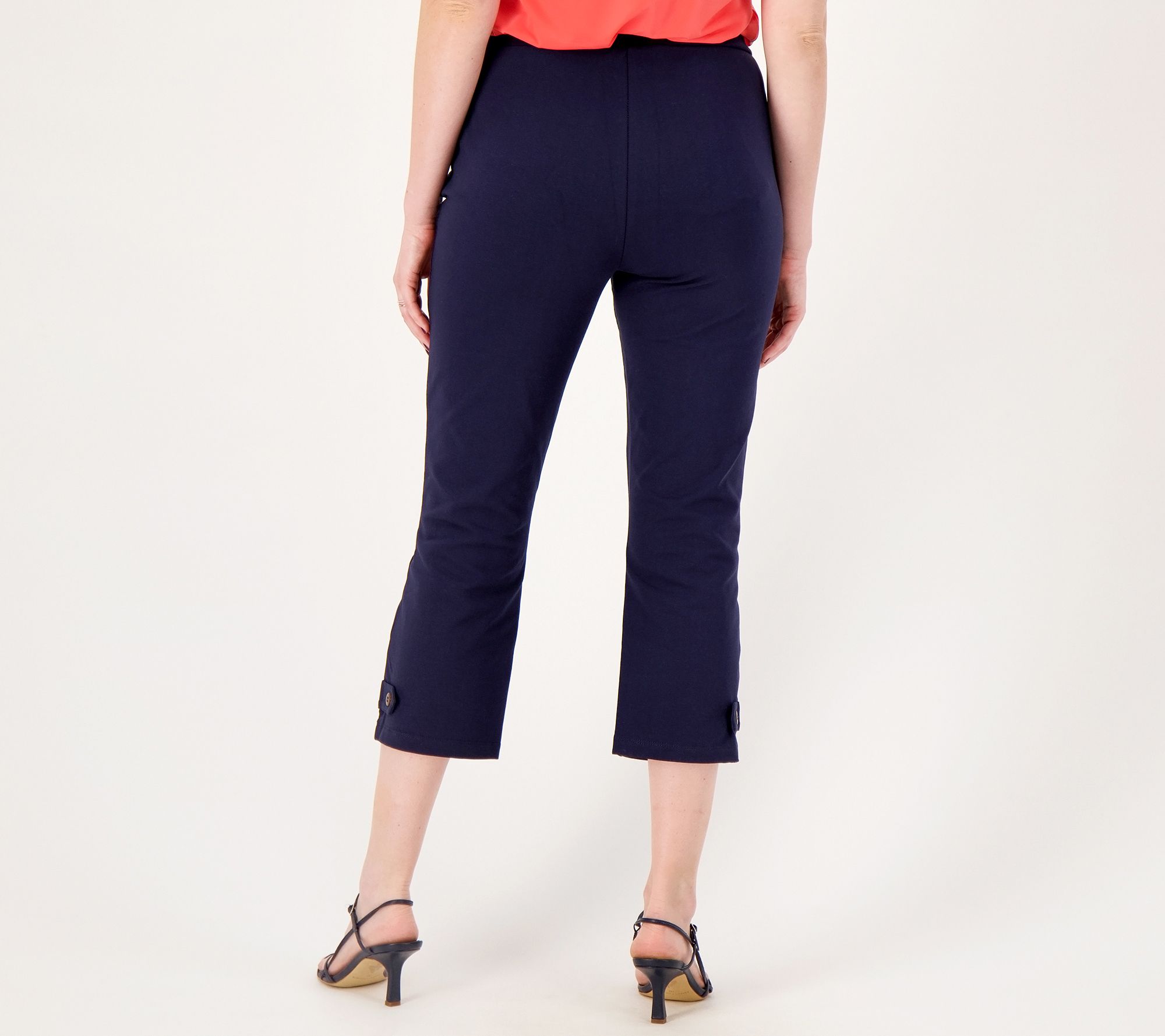 These pull-on style pants with a stylish tab detail boast plenty of comfortable stretch and a trendy crop cut so you can keep cozy and cute in warmer weather. From Susan Graver.