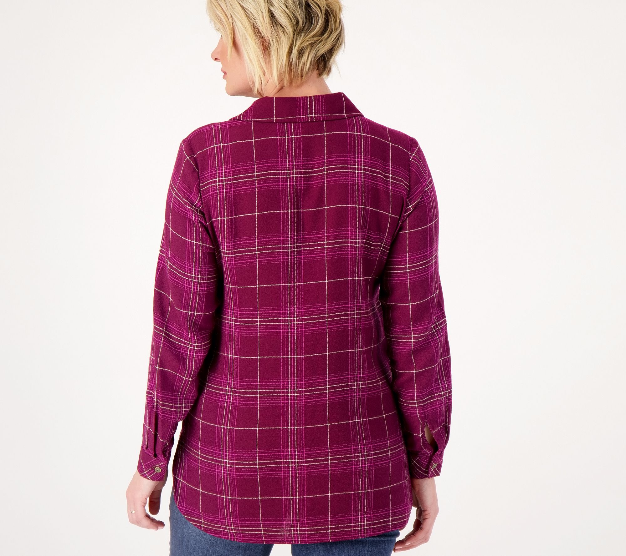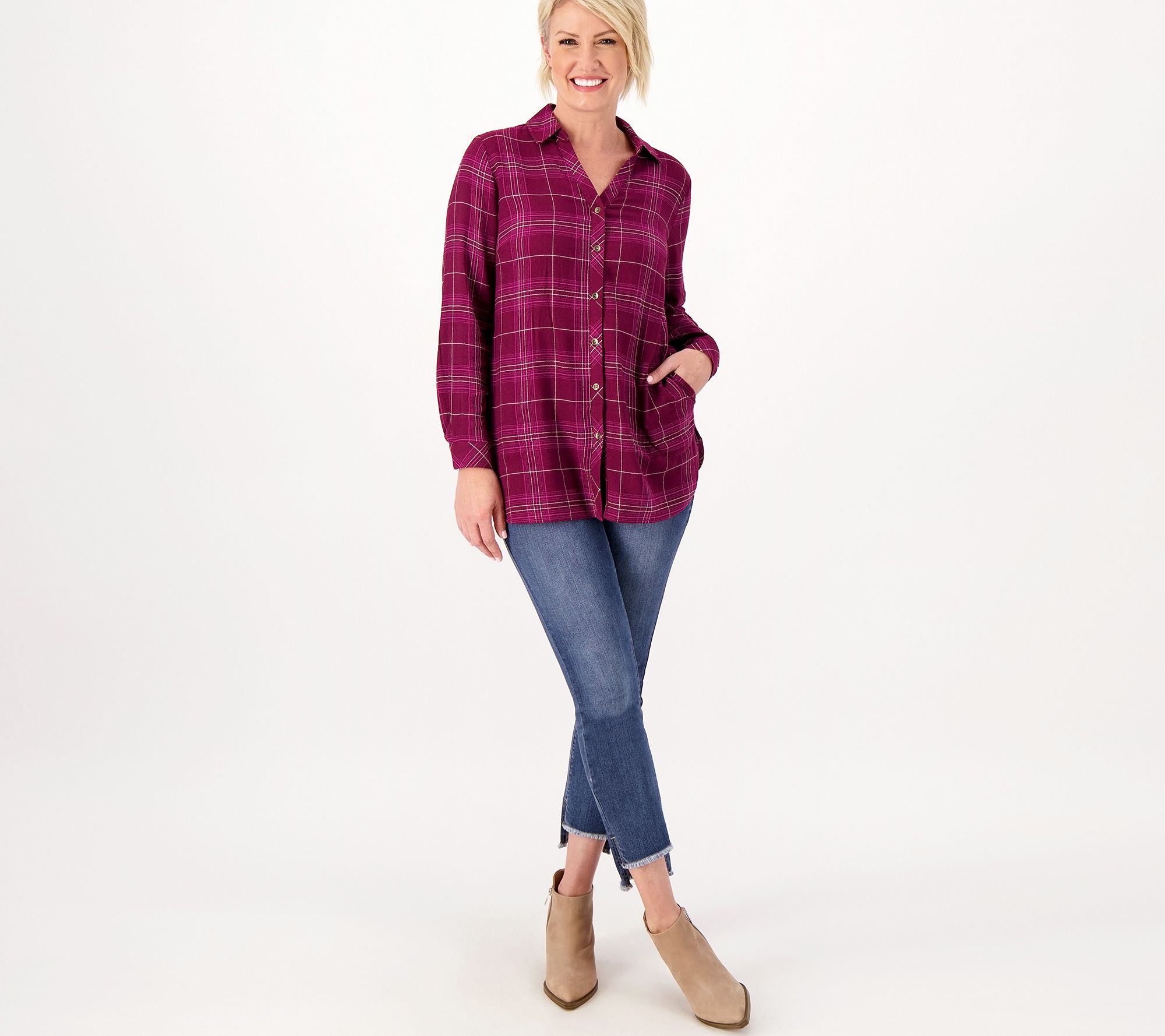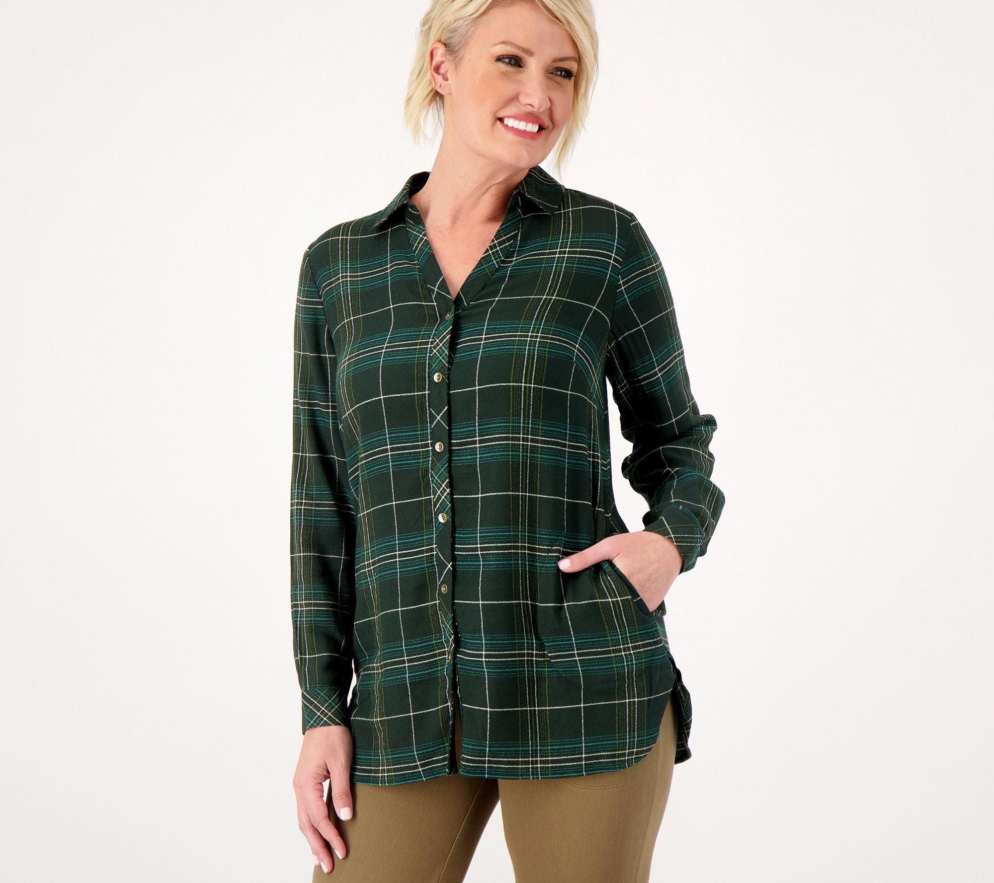 This button-front shirt provides a subtly chic option to top off your more casual outfits. Pair it with your favorite leggings and a pair of leather boots to instantly boost an everyday look. From Susan Graver.