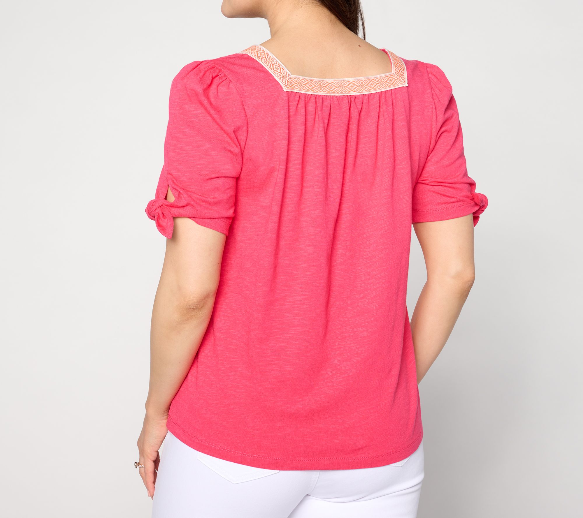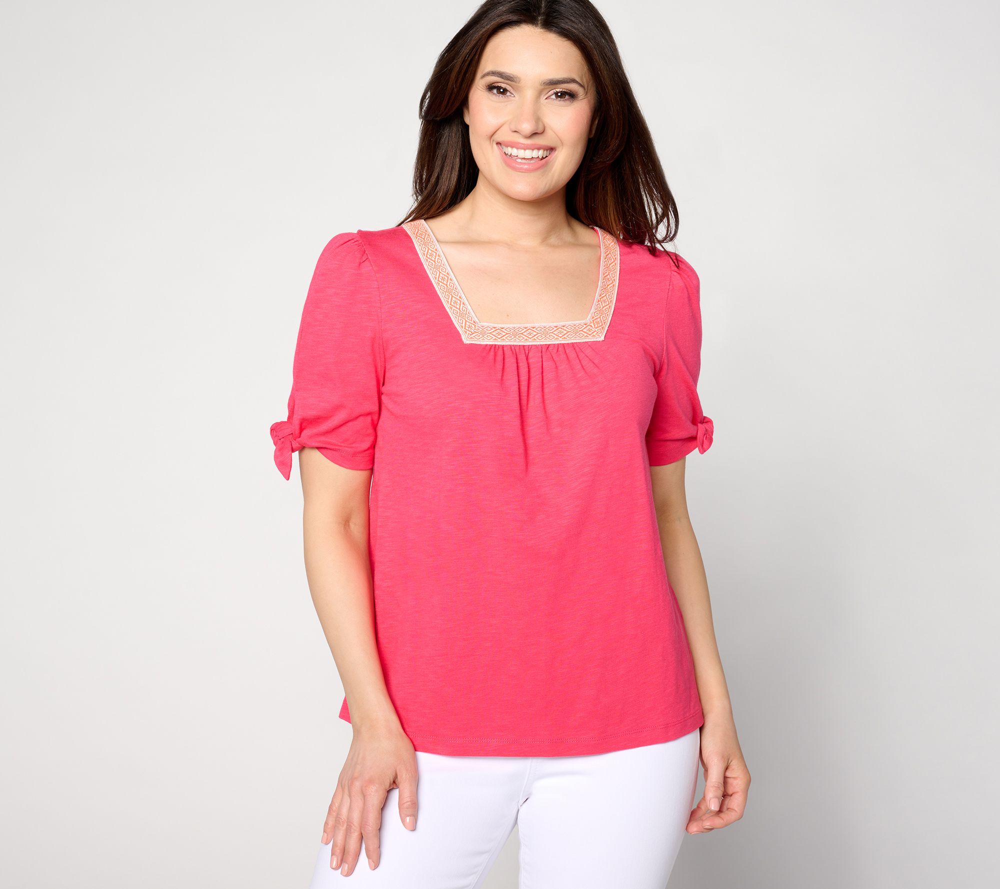 Tees and tanks: take the day off! This textured tie-sleeve top will totally tip the scale on your OOTD to a casual-chic vibe. Pair with it white crops or a denim maxi for a boho moment. From Susan Graver.