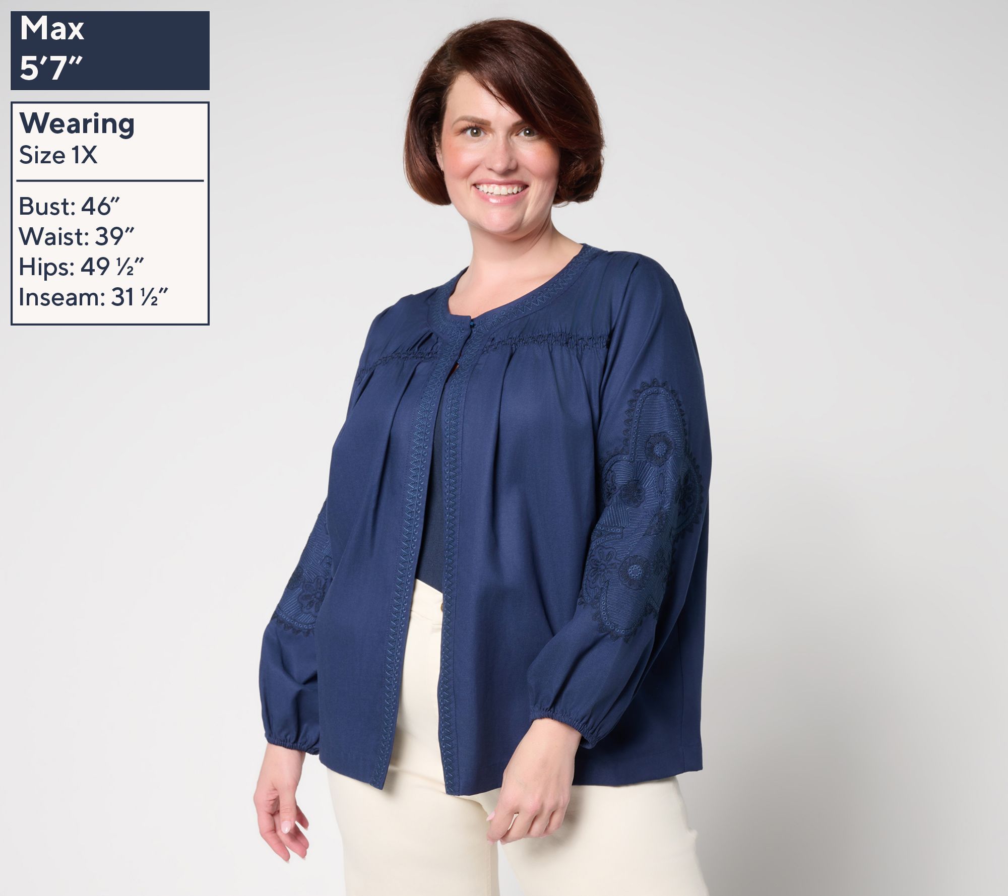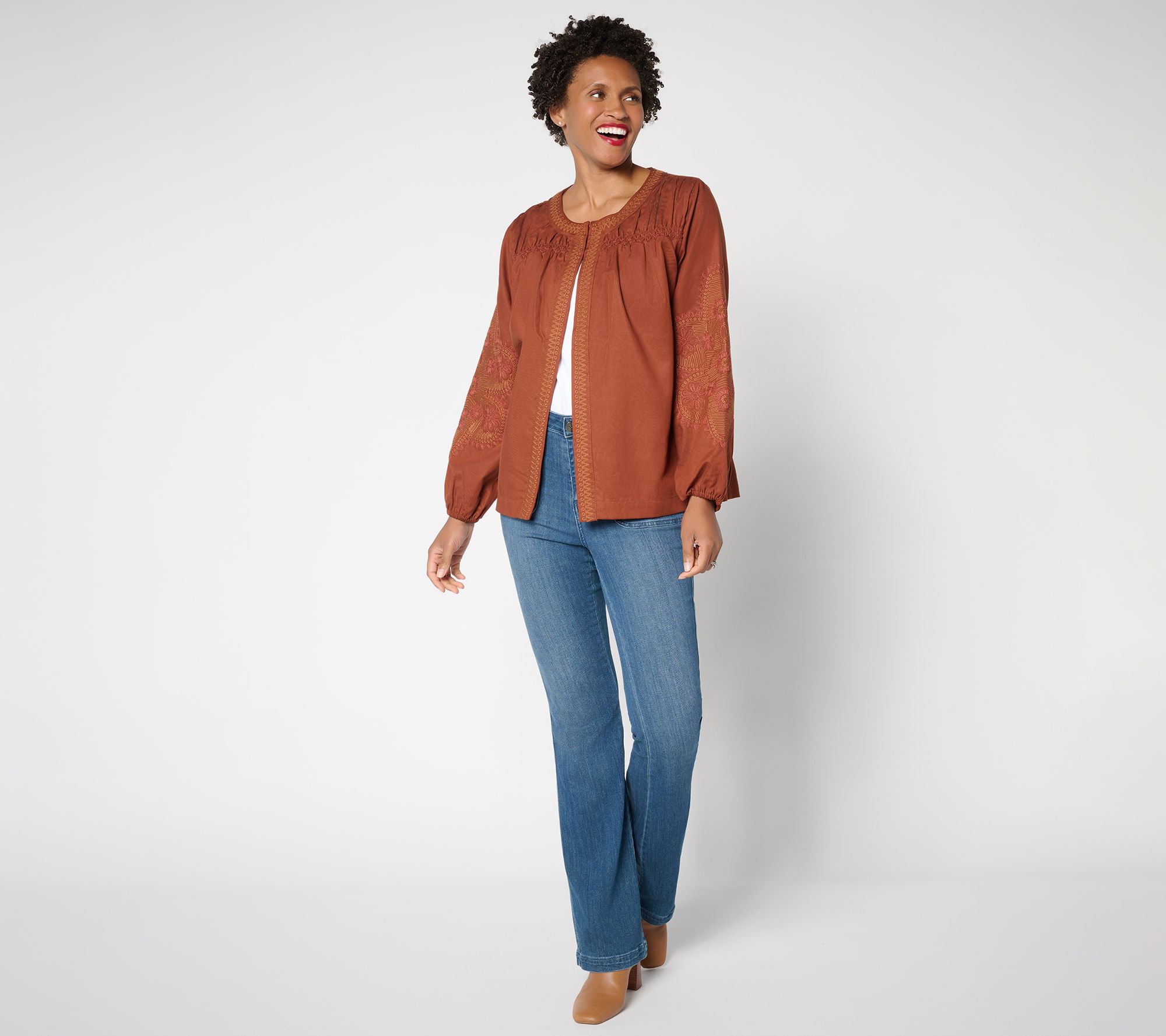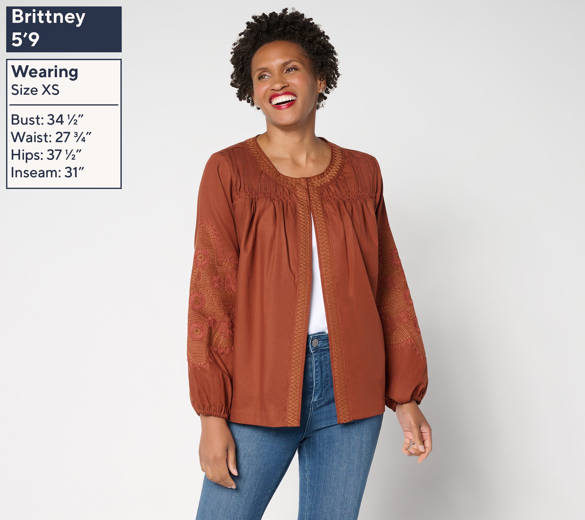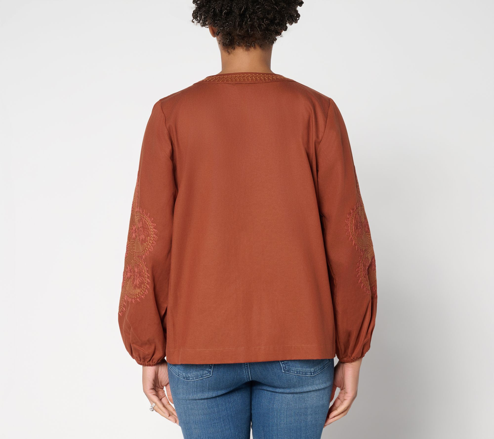 Not just any layer. Susan Graver's washed twill jacket bumps up your coverage options with a playful spin, adding eye-catching embroidered details to sleeveless and strapless pieces. Those blouson sleeves? Watch them elevate even your most lived-in denim. From Susan Graver.