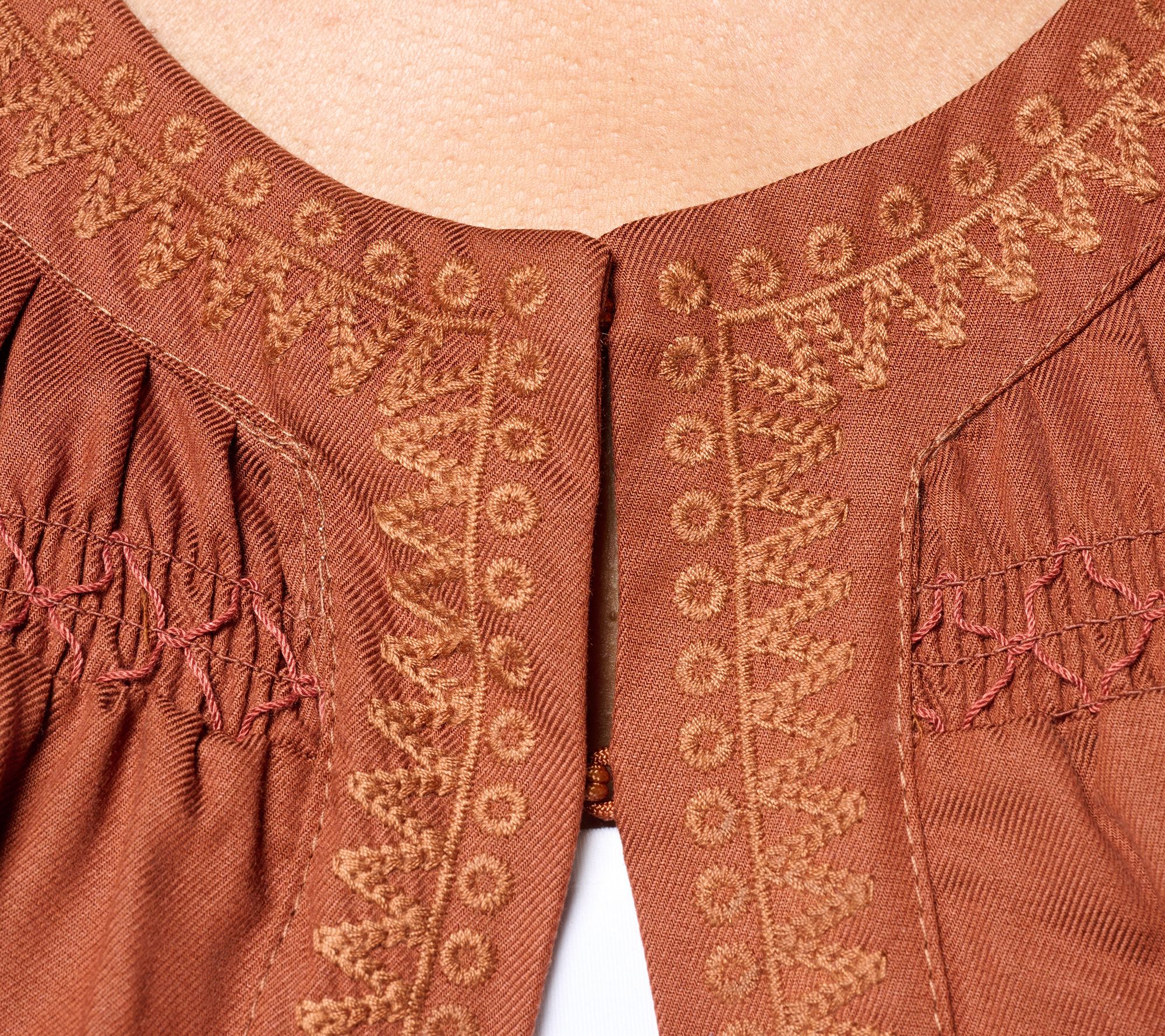 • Features: embroidery at crew neckline, center front placket, and smocked seam across upper chest; long blouson sleeves with elastic-encased sleeve opening; straight hemline