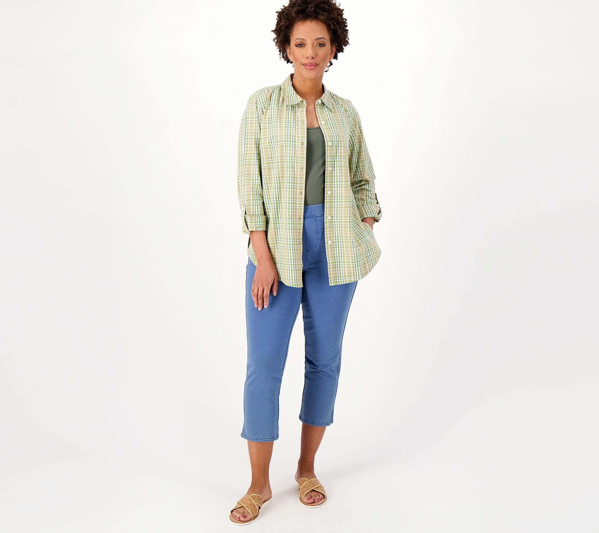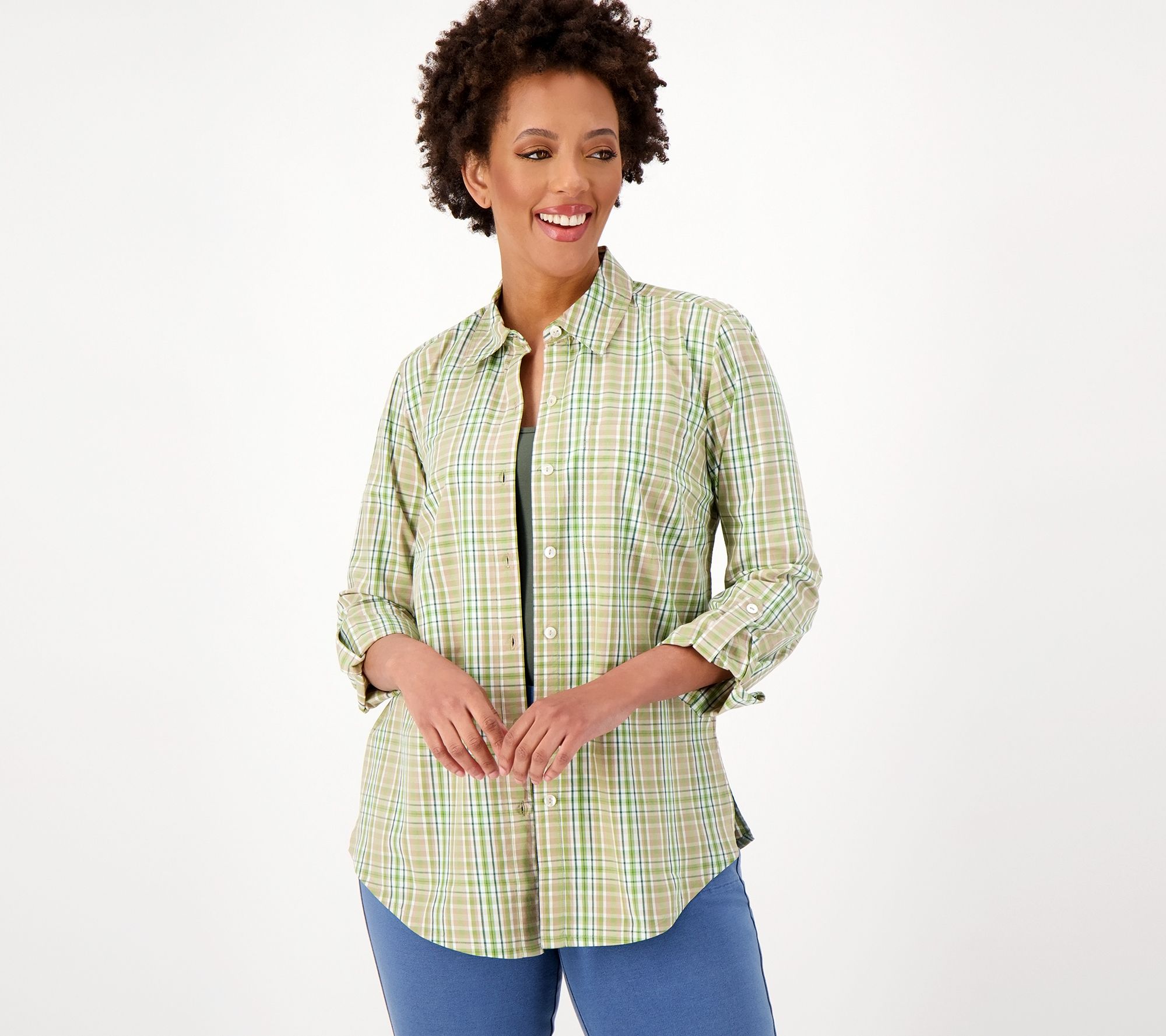 Embrace the ultimate casual classic: the plaid button-front shirt. With a yarn-dyed woven fabric and roll-tab long sleeves, this feel-good favorite earns a treasured spot in your weekend rotation. From Susan Graver.