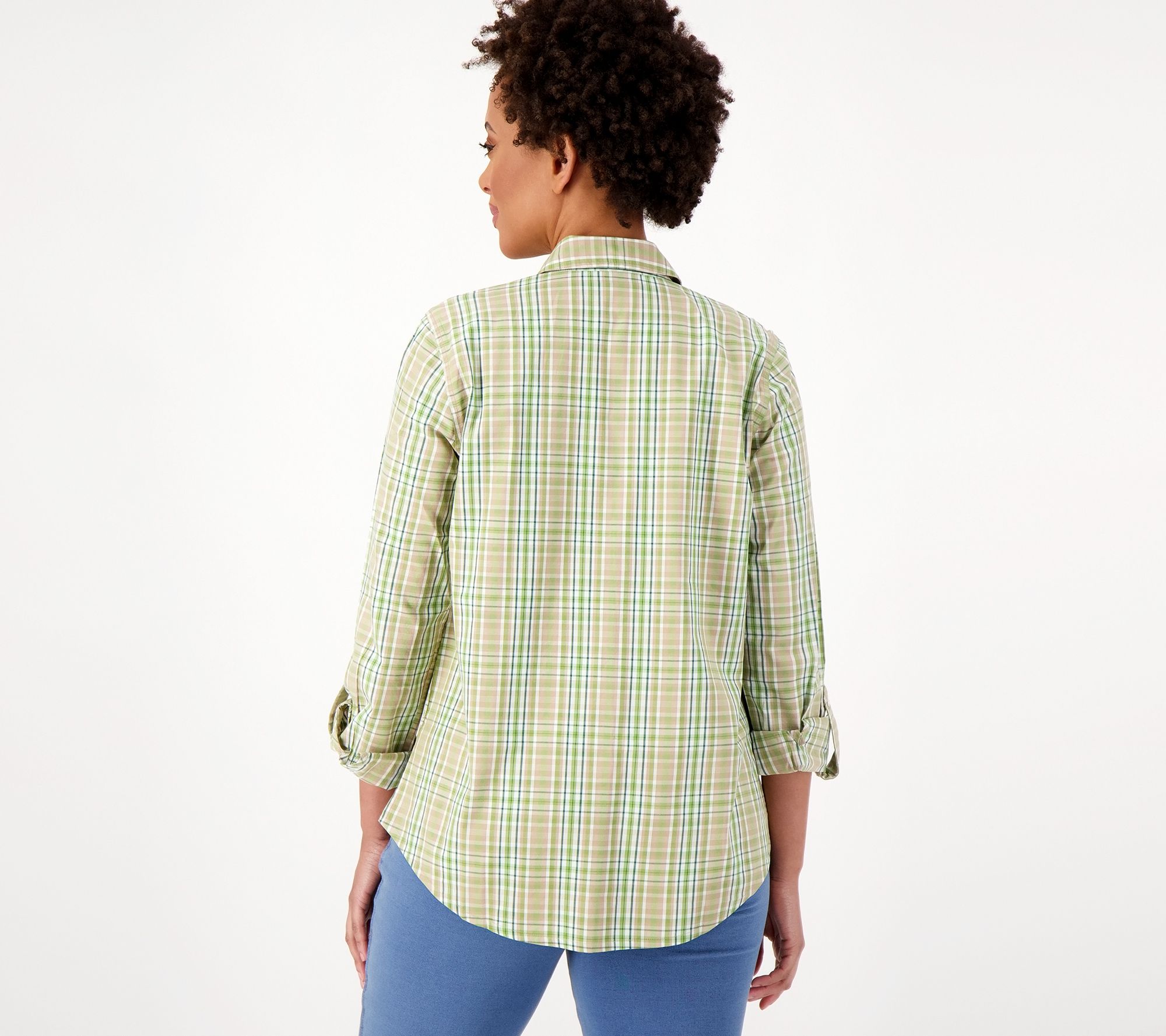Embrace the ultimate casual classic: the plaid button-front shirt. With a yarn-dyed woven fabric and roll-tab long sleeves, this feel-good favorite earns a treasured spot in your weekend rotation. From Susan Graver.