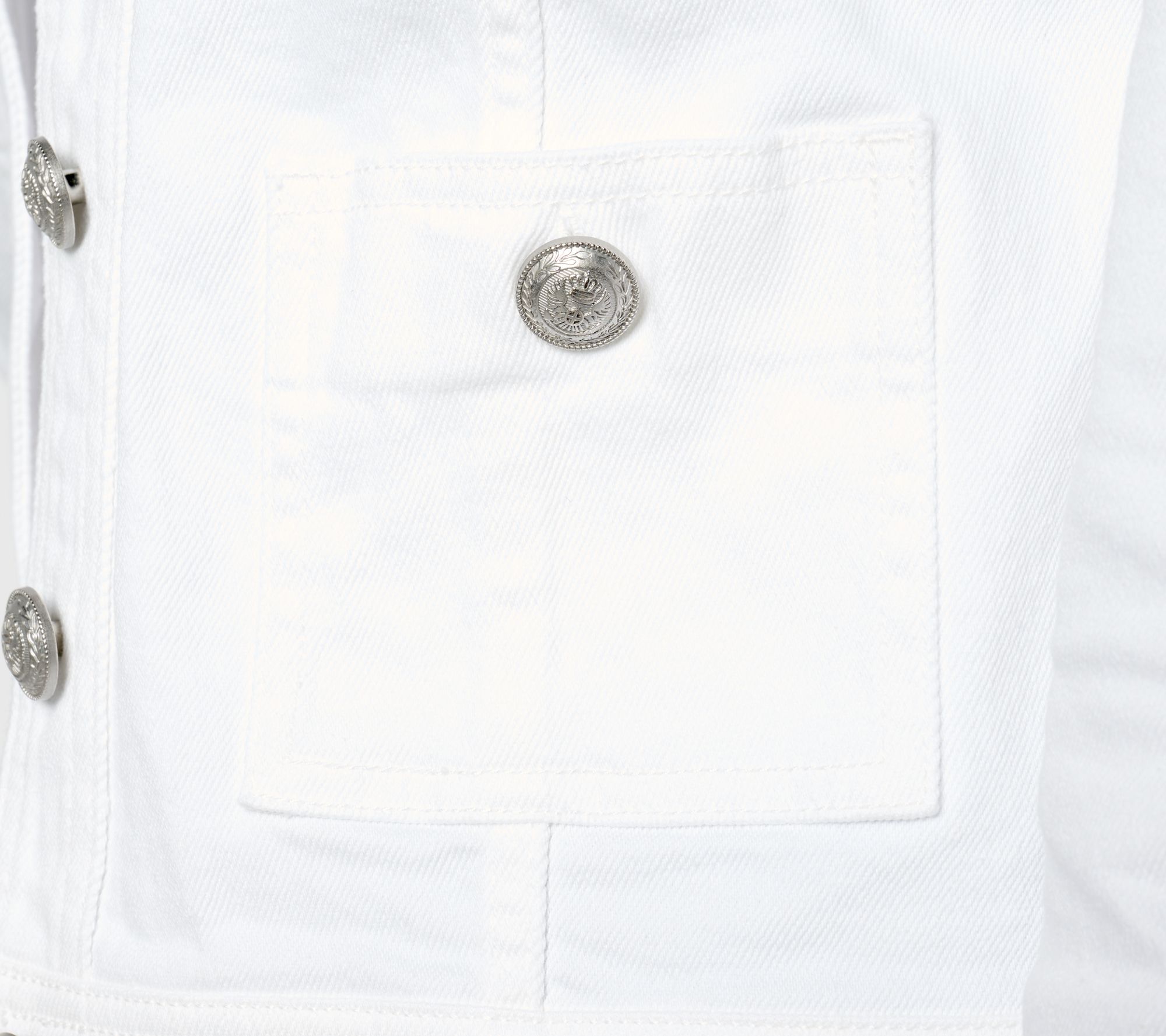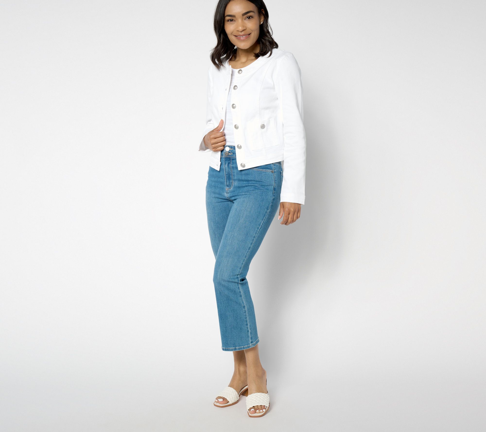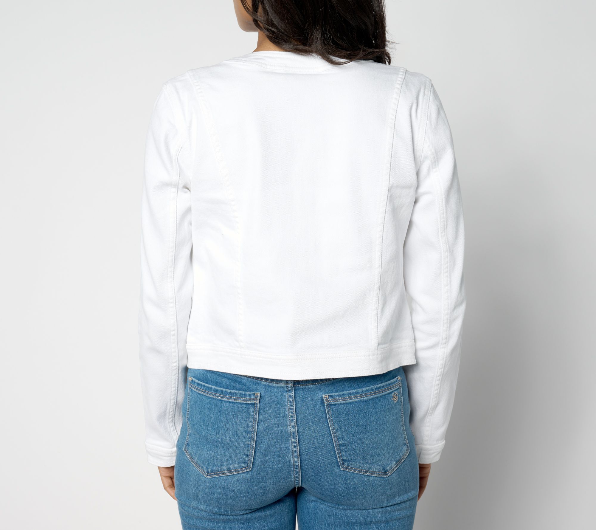 A crisp classic, this white stretch denim jacket ditches the collar for a more laid-back look. From Susan Graver.