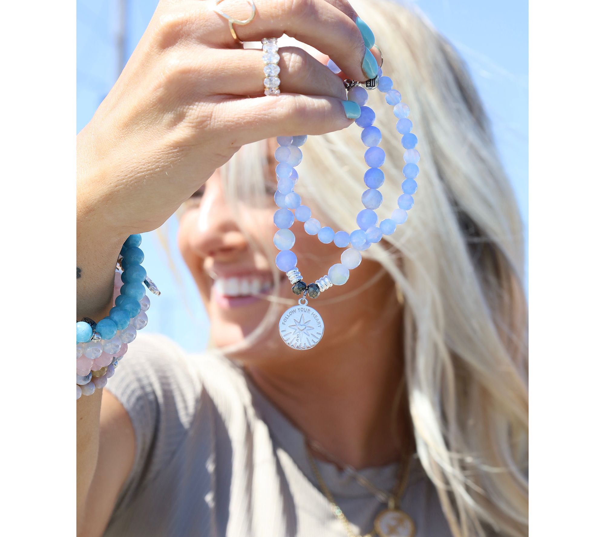 • Compass Heart: sky blue agate beads; engraved charm with "Follow Your Heart" back