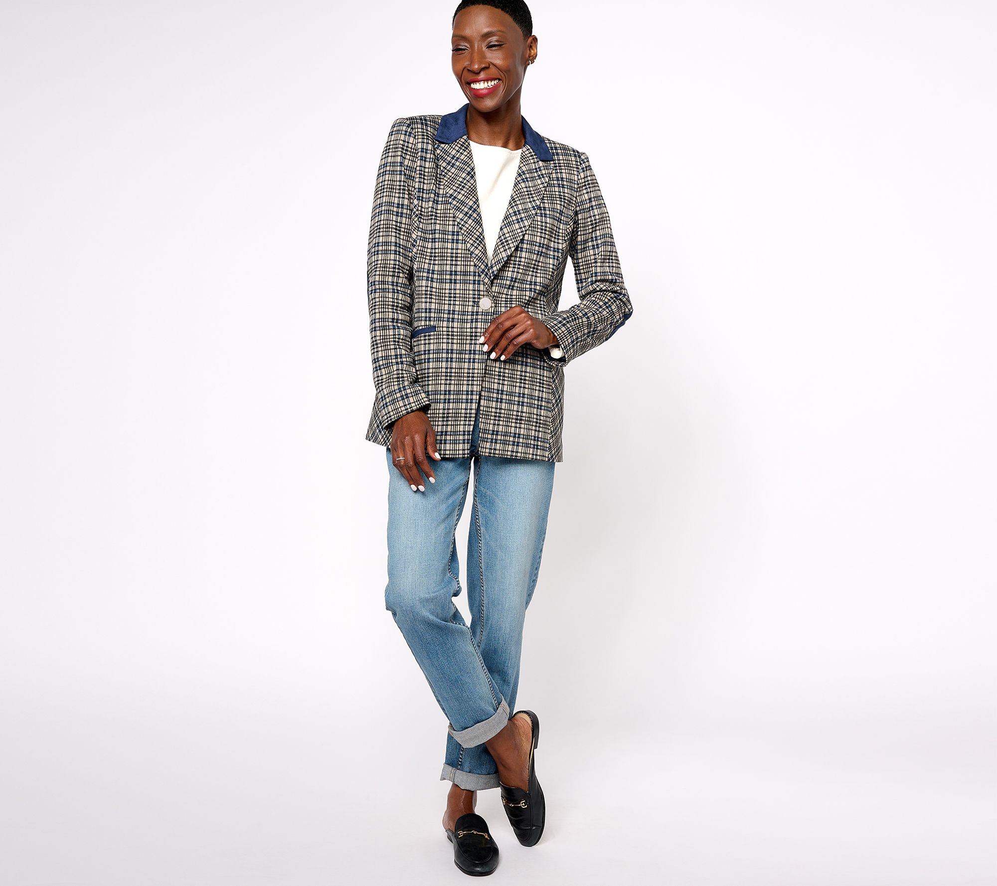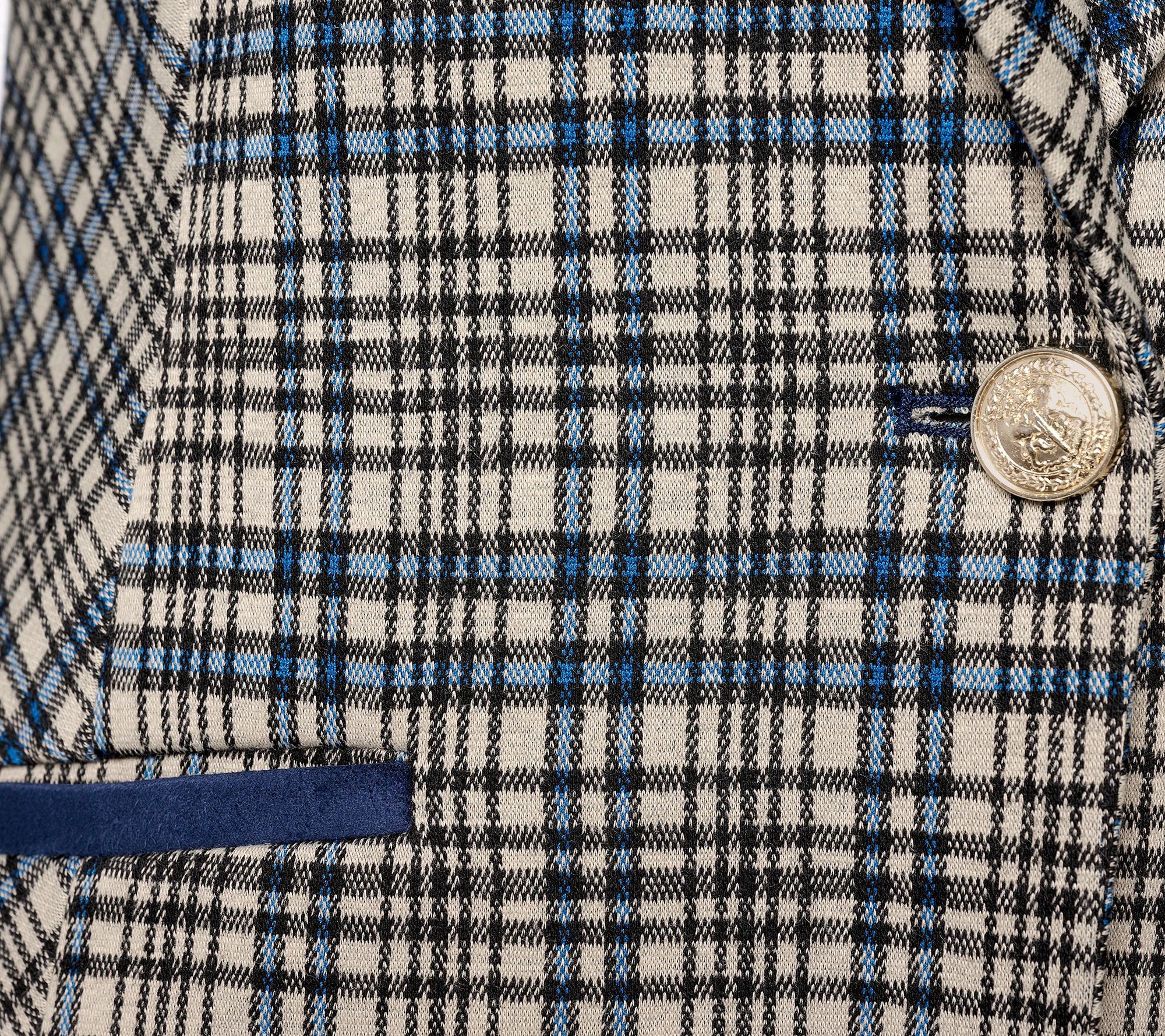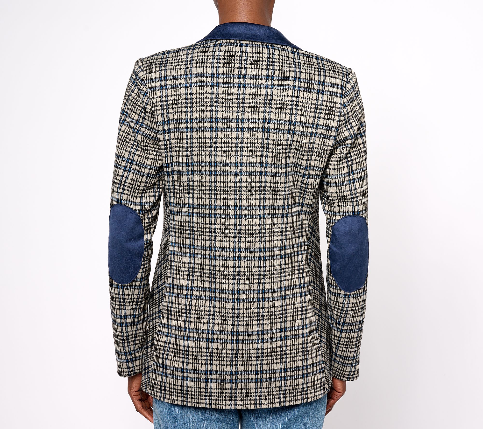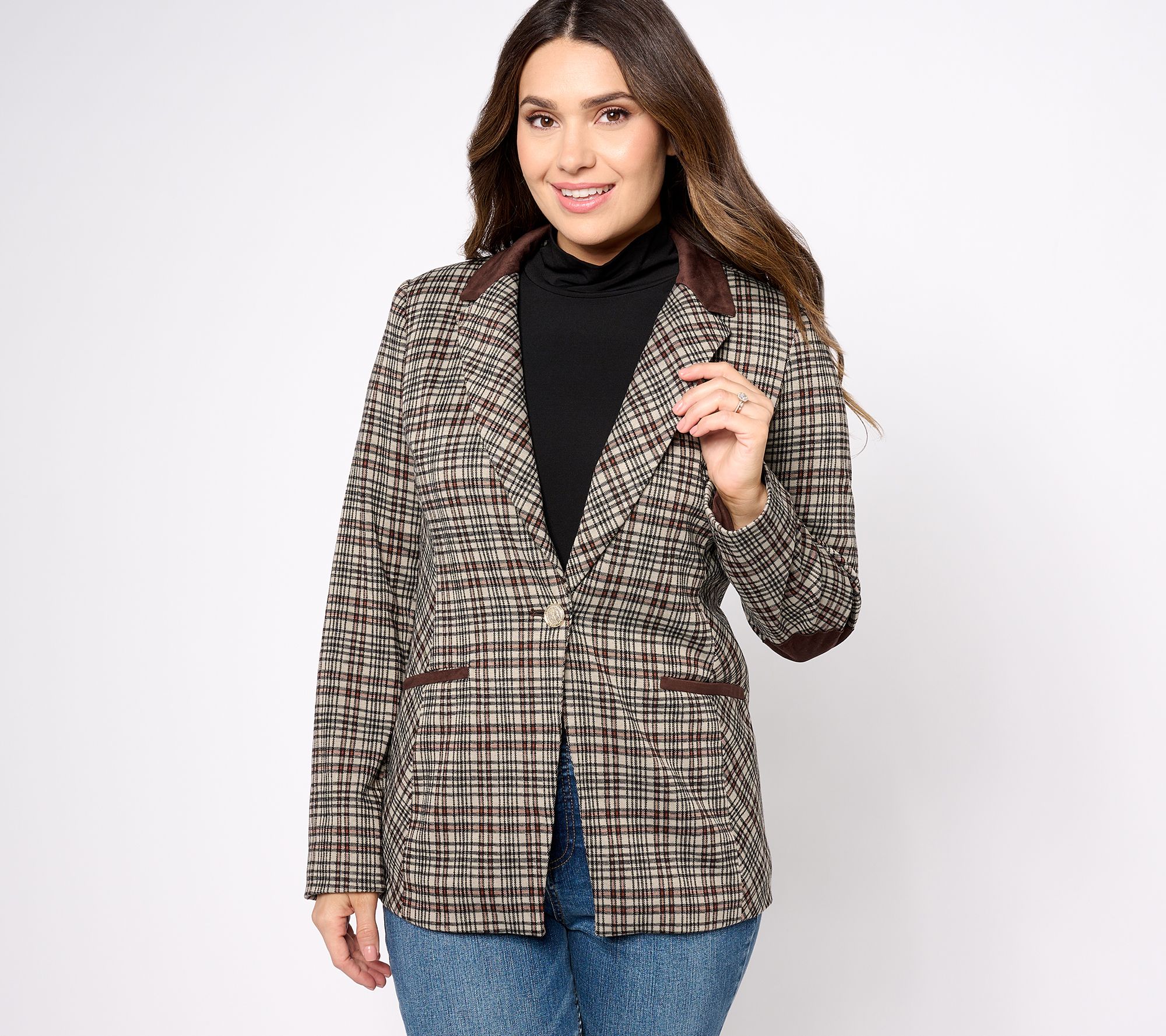 • Features: allover plaid jacquard design, faux suede collar, notch lapel, long sleeves with faux suede elbow patches, besom pockets, one-button front closure, cutaway hem, fully lined
