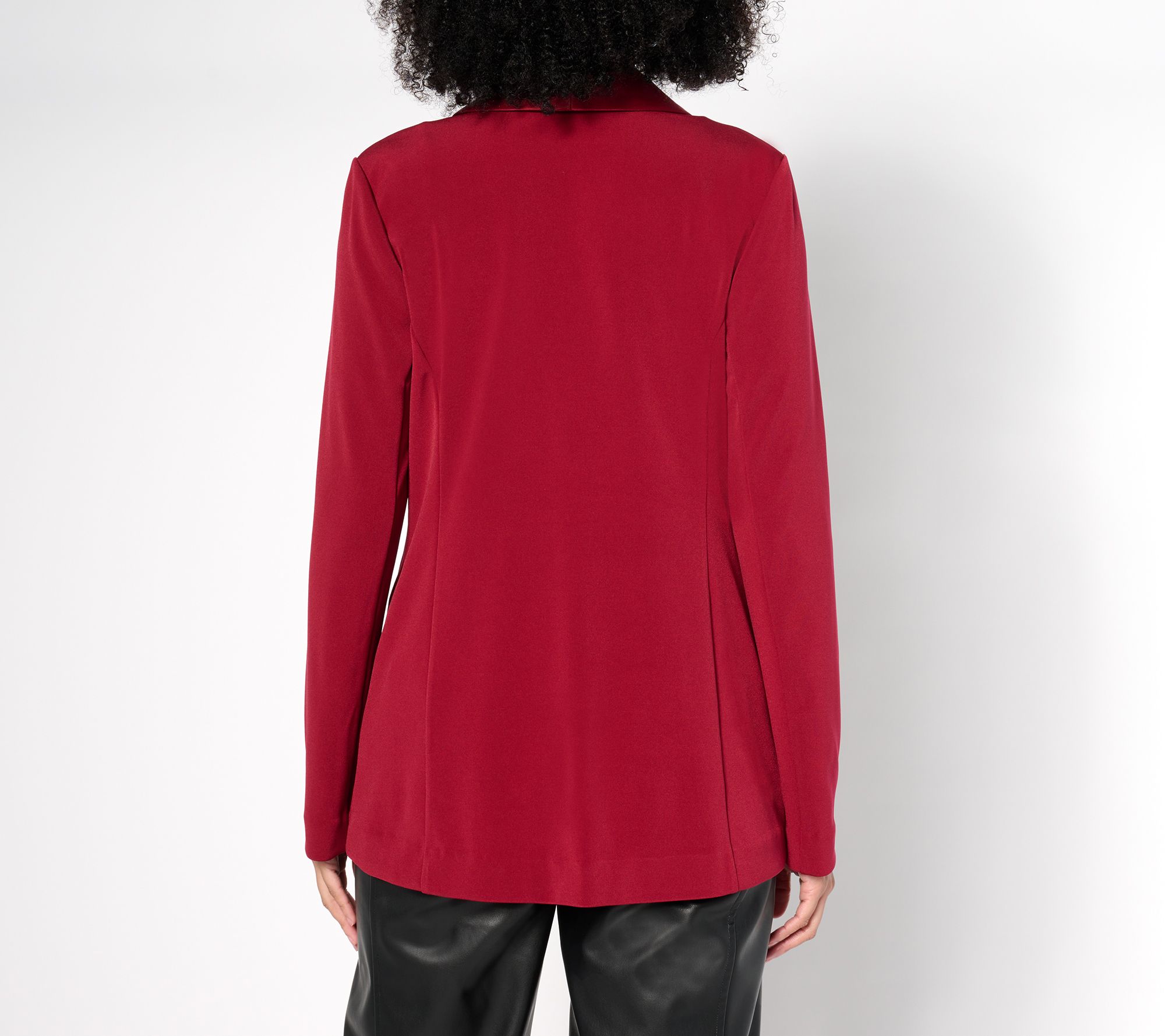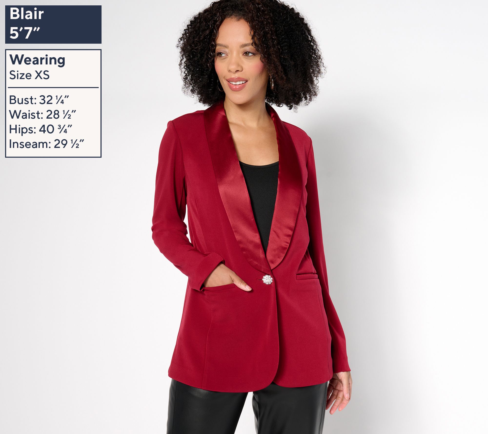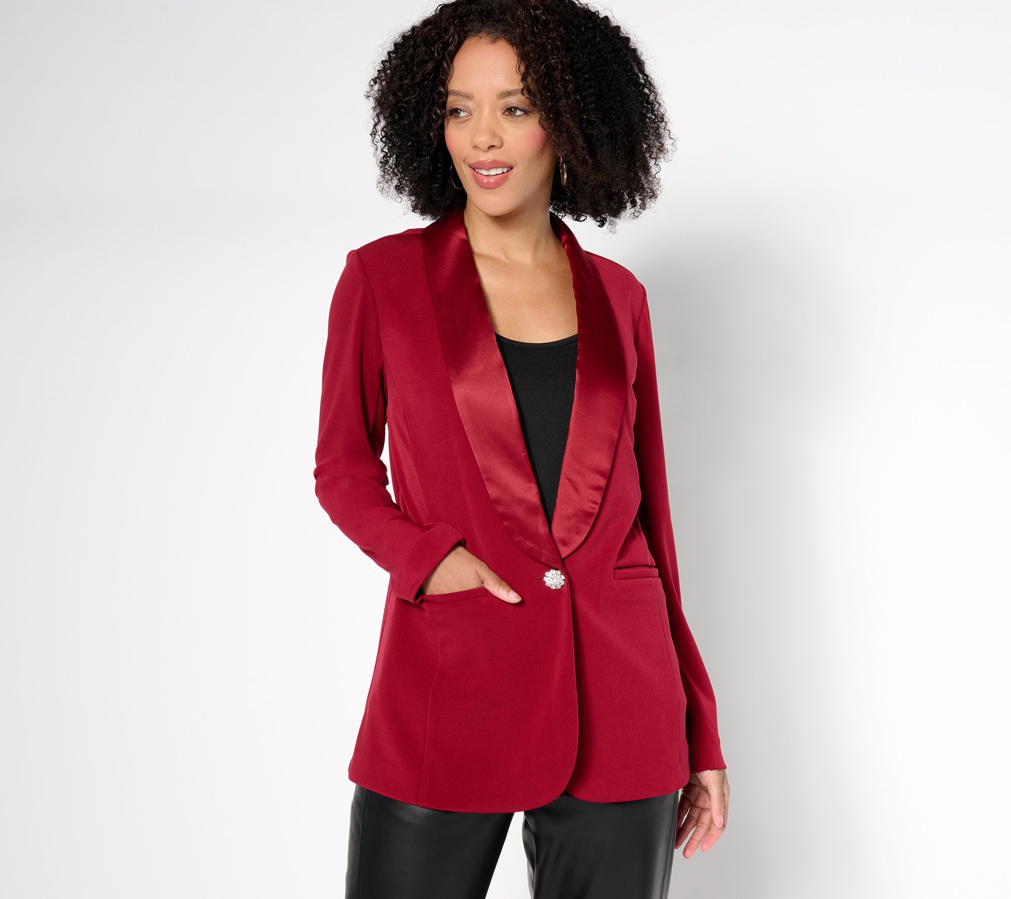 Get ready to turn heads with this stunning blazer. Whether you're dressing for a big meeting or a night out, its elegant satin collar and sleek fit promise to elevate your style and leave you looking polished and timeless. From Susan Graver.