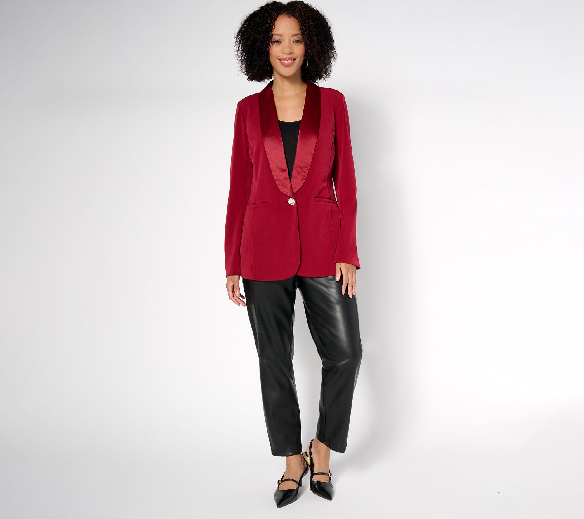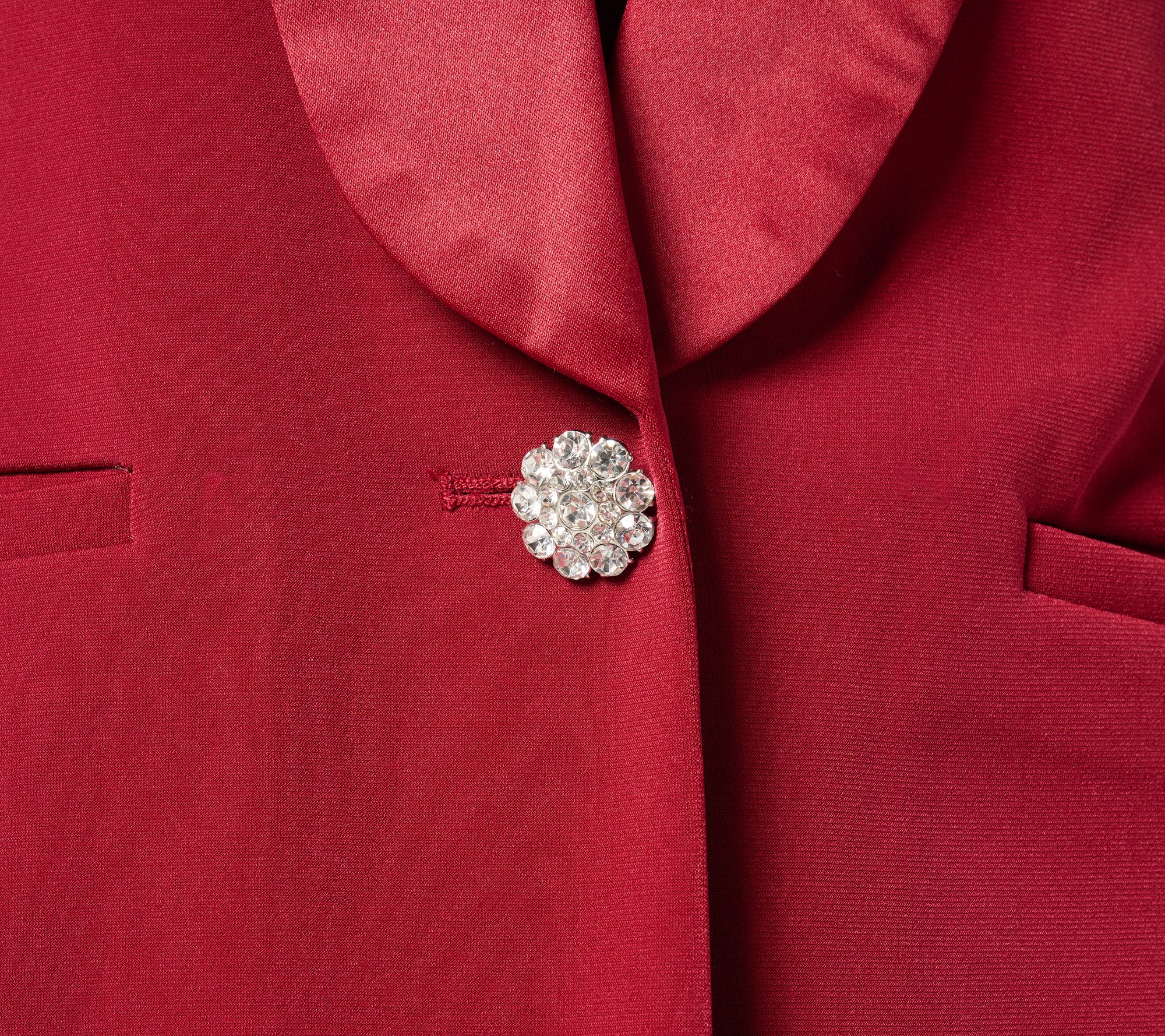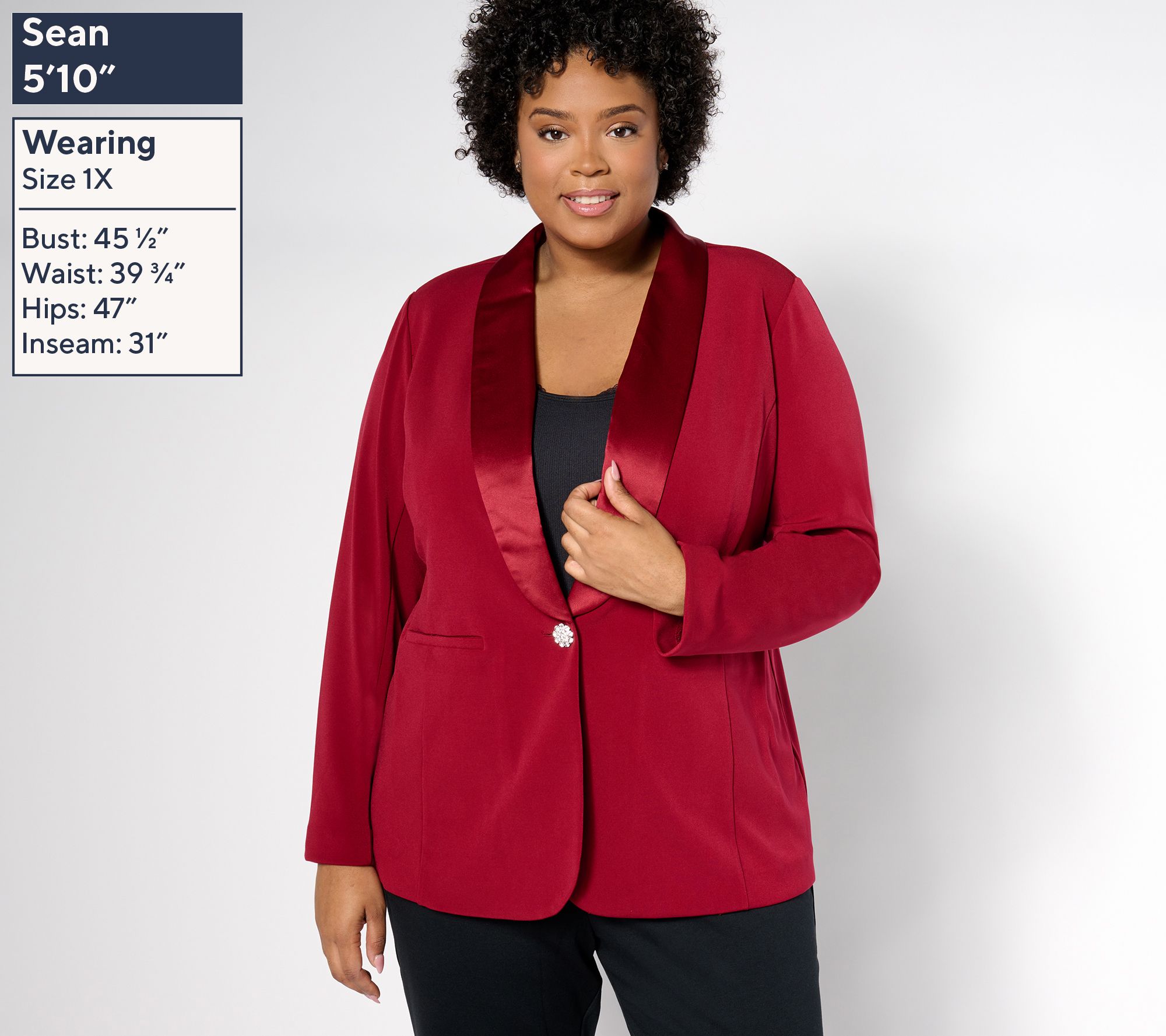Get ready to turn heads with this stunning blazer. Whether you're dressing for a big meeting or a night out, its elegant satin collar and sleek fit promise to elevate your style and leave you looking polished and timeless. From Susan Graver.