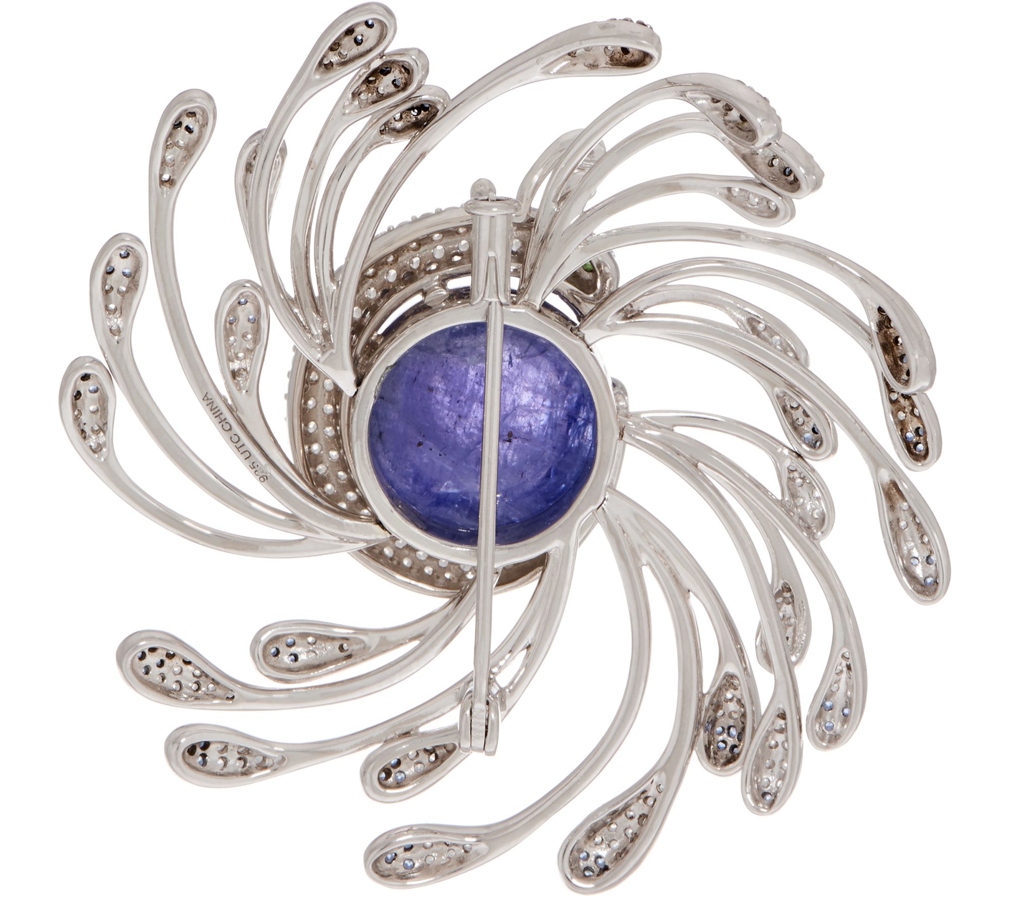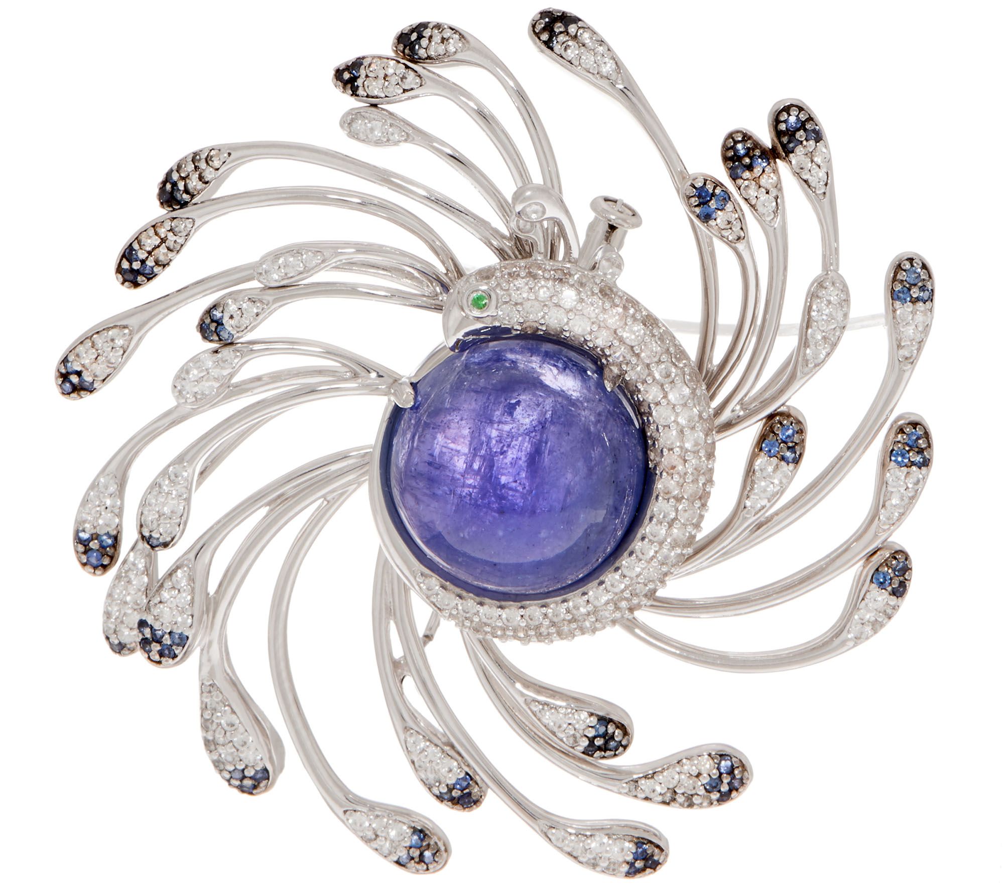 • Peacock design; prong-set, round tanzanite cabochon in center; bezel-set, round tsavorite eye; pave-set, round white zircon in body; bead-set, round blue sapphire and white zircon feathers