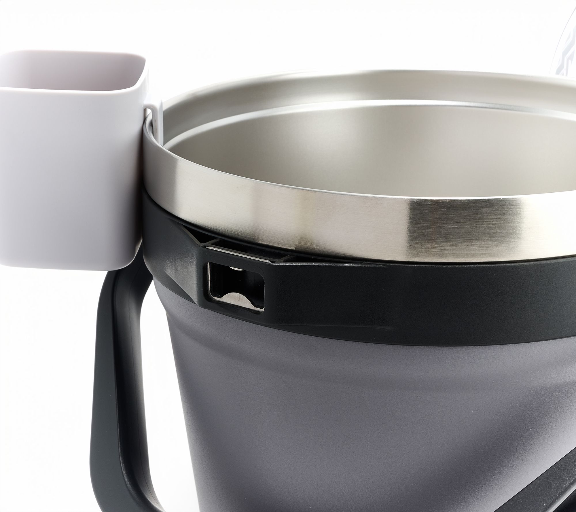 • Includes ice bucket with carry handle, bottle opener, lid with hook, and storage box/cup