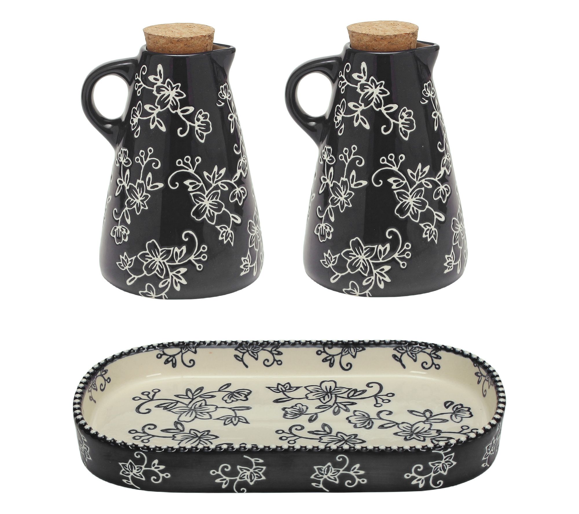• Includes 16-oz oil dispenser with cork lid, 16-oz vinegar dispenser with cork lid, and tray