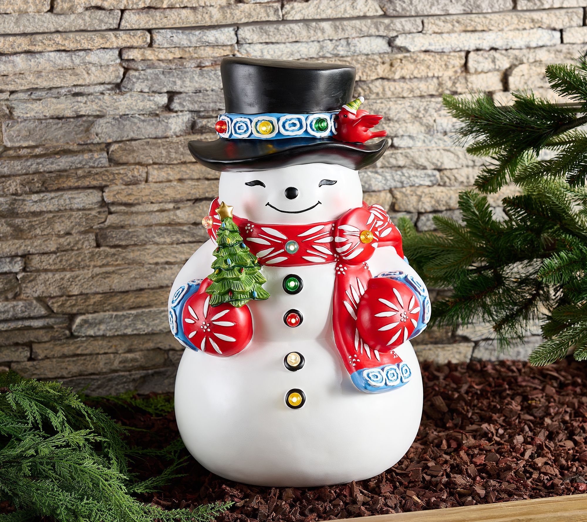 Standing at nearly two feet tall with his cardinal bestie perched on his top hat, this cheery snowman brings seasonal whimsy (and a festive tree) to your home -- indoors and out. From Temp-tations®.