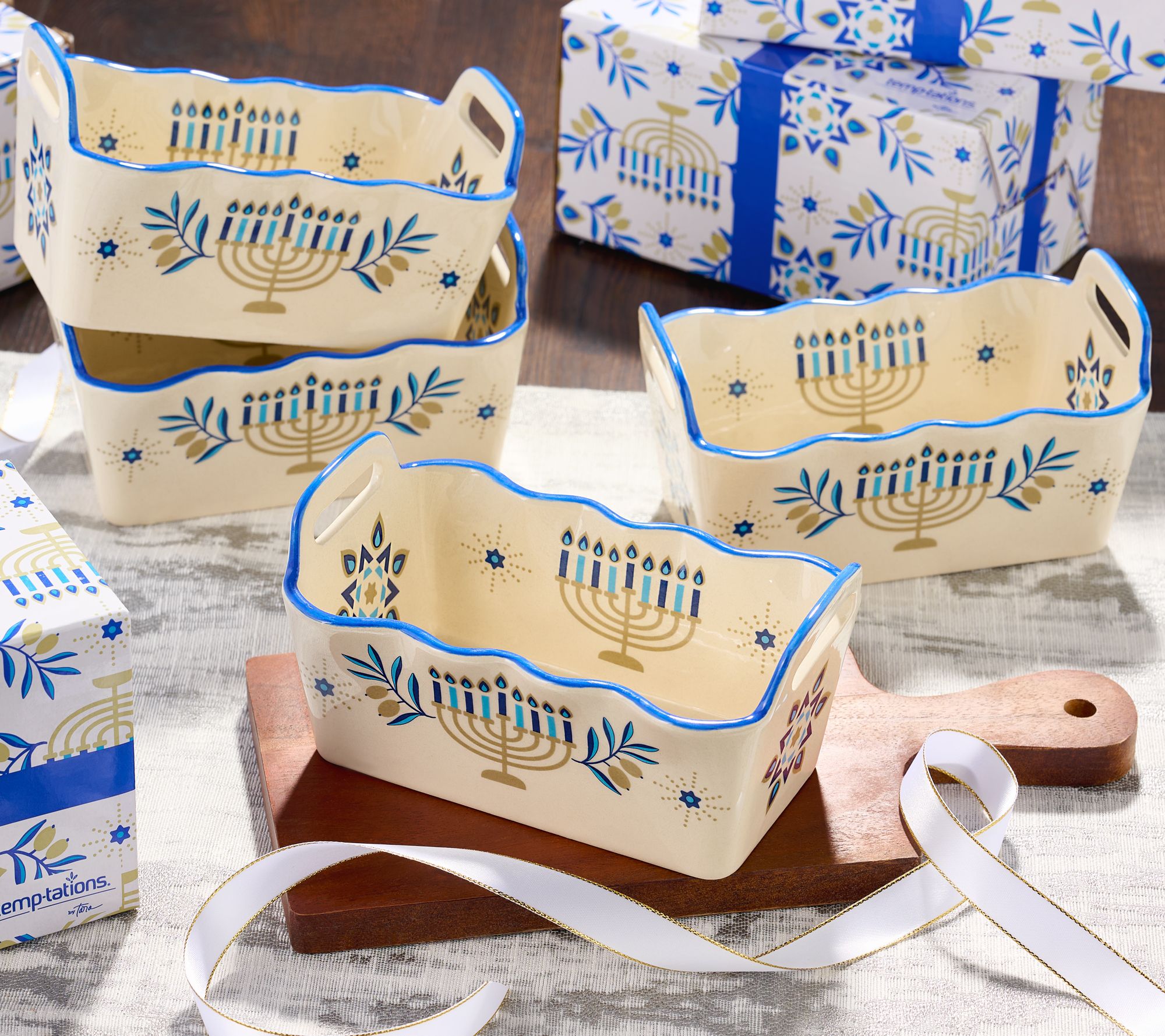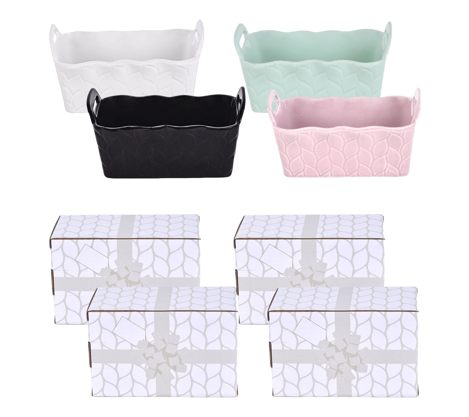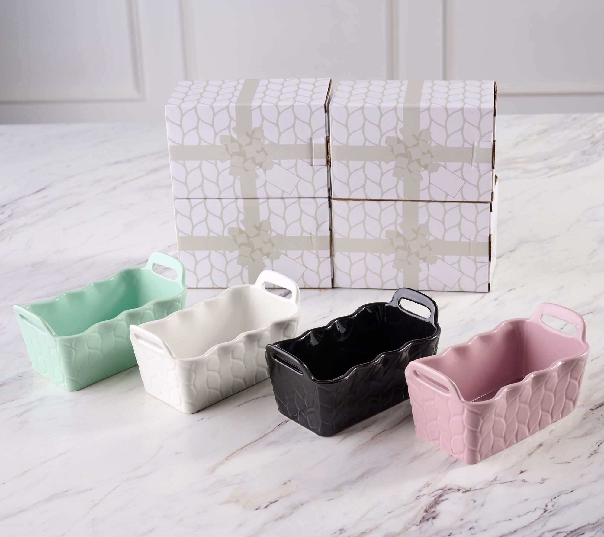 • Includes four 12-oz ruffled mini loaf pans and gift boxes