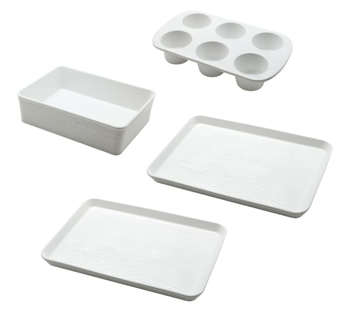 Includes two ceramic baking sheets, one small ceramic rectangular pan, and one six-cup ceramic muffin pan