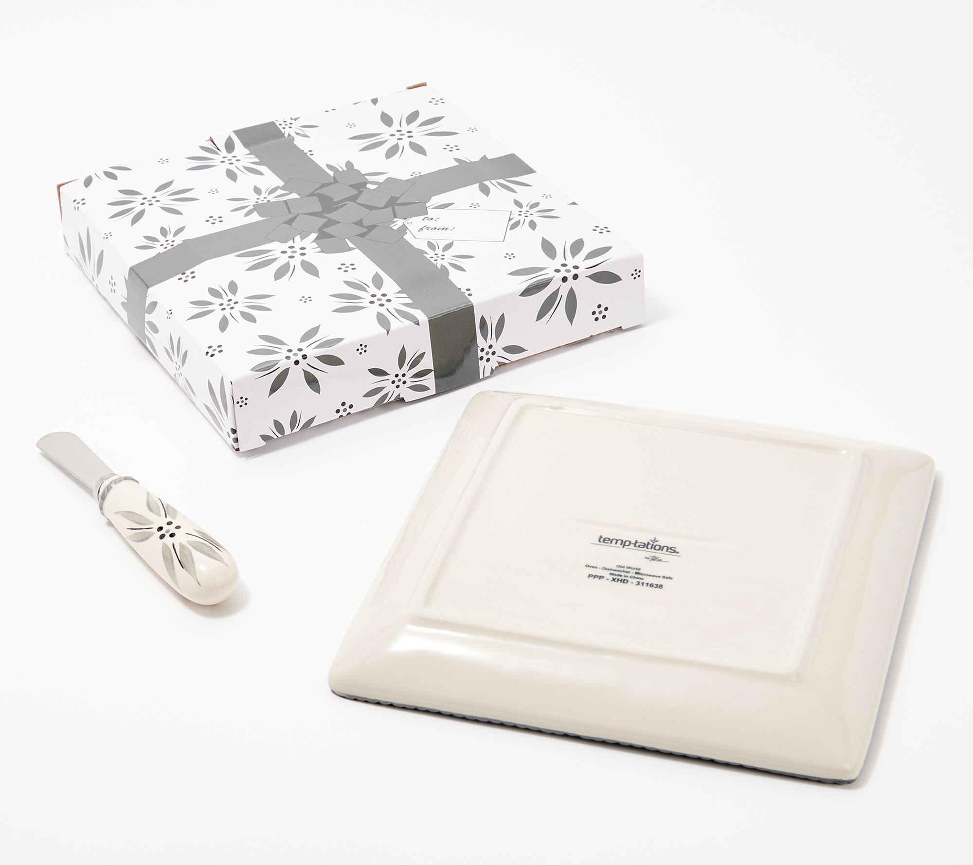 Prep... and plate! Serve up something special on this set of ceramic plates, each with a spreader (perf when serving soft cheese) and gift box (for friends that hold a soft spot in your heart). From Temp-tations® Ovenware.