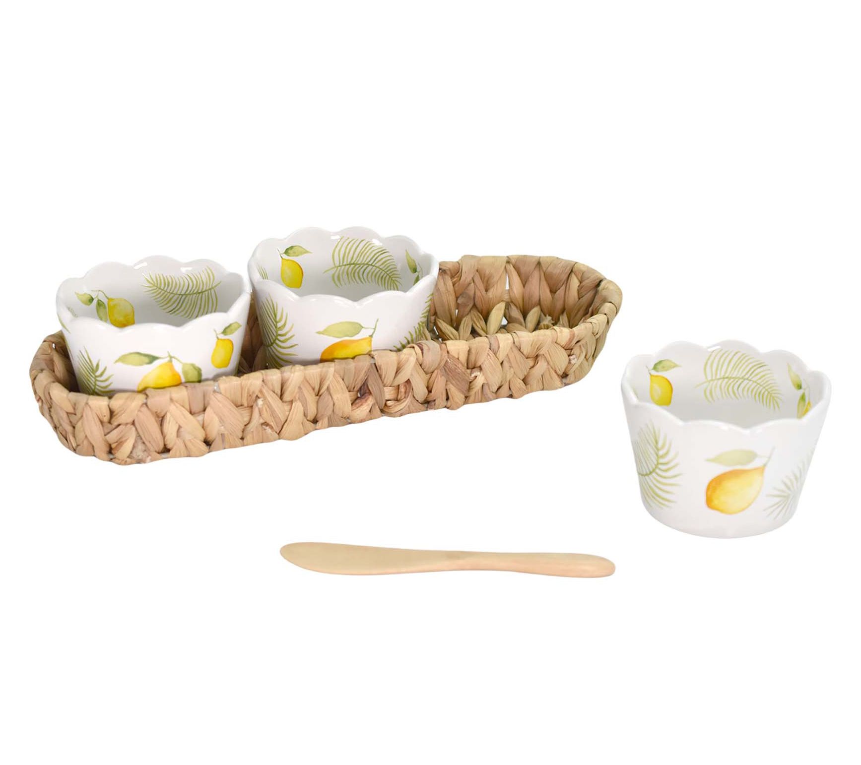 • Includes three 6-oz ceramic bowls, hyacinth basket, and spreader