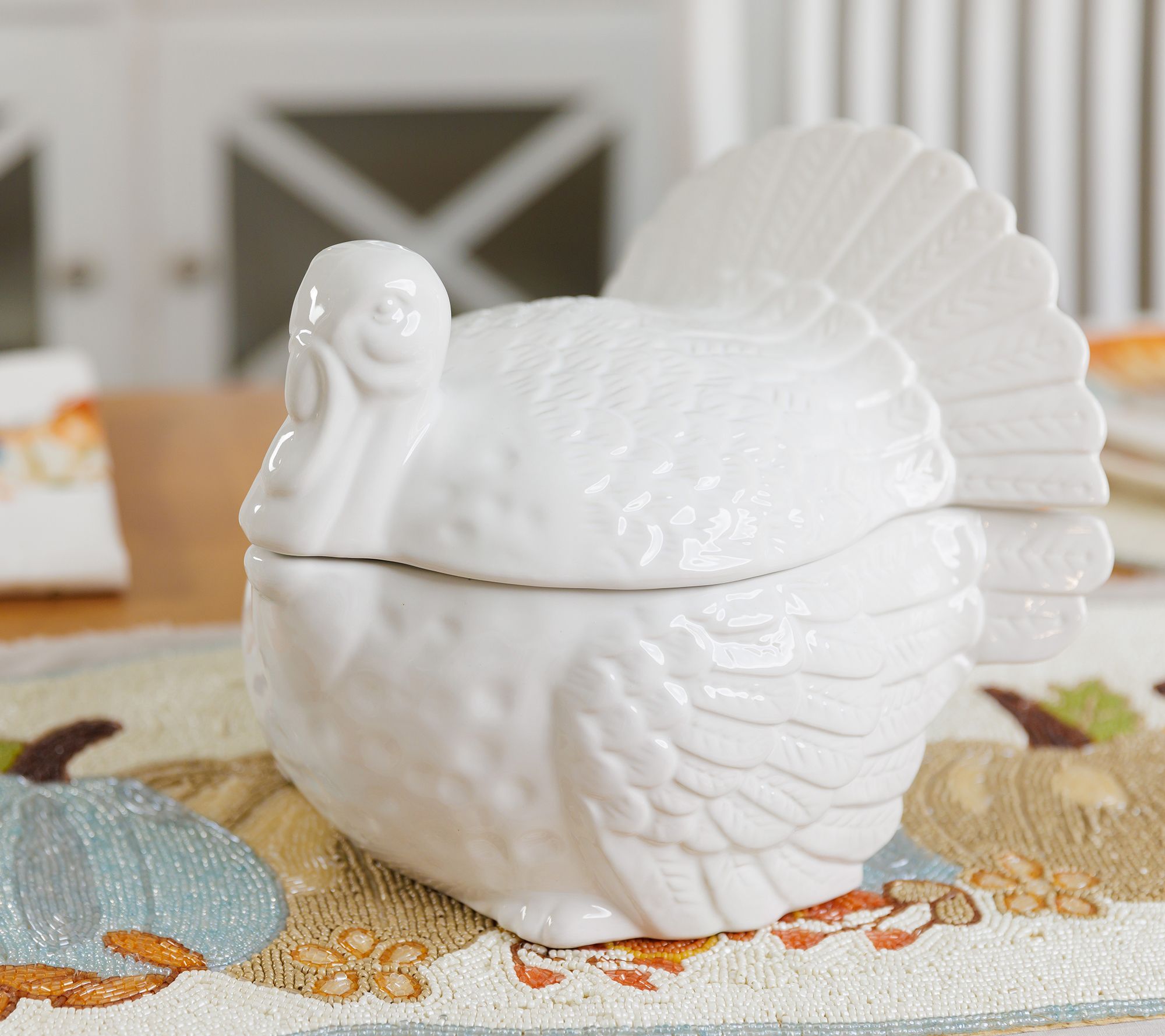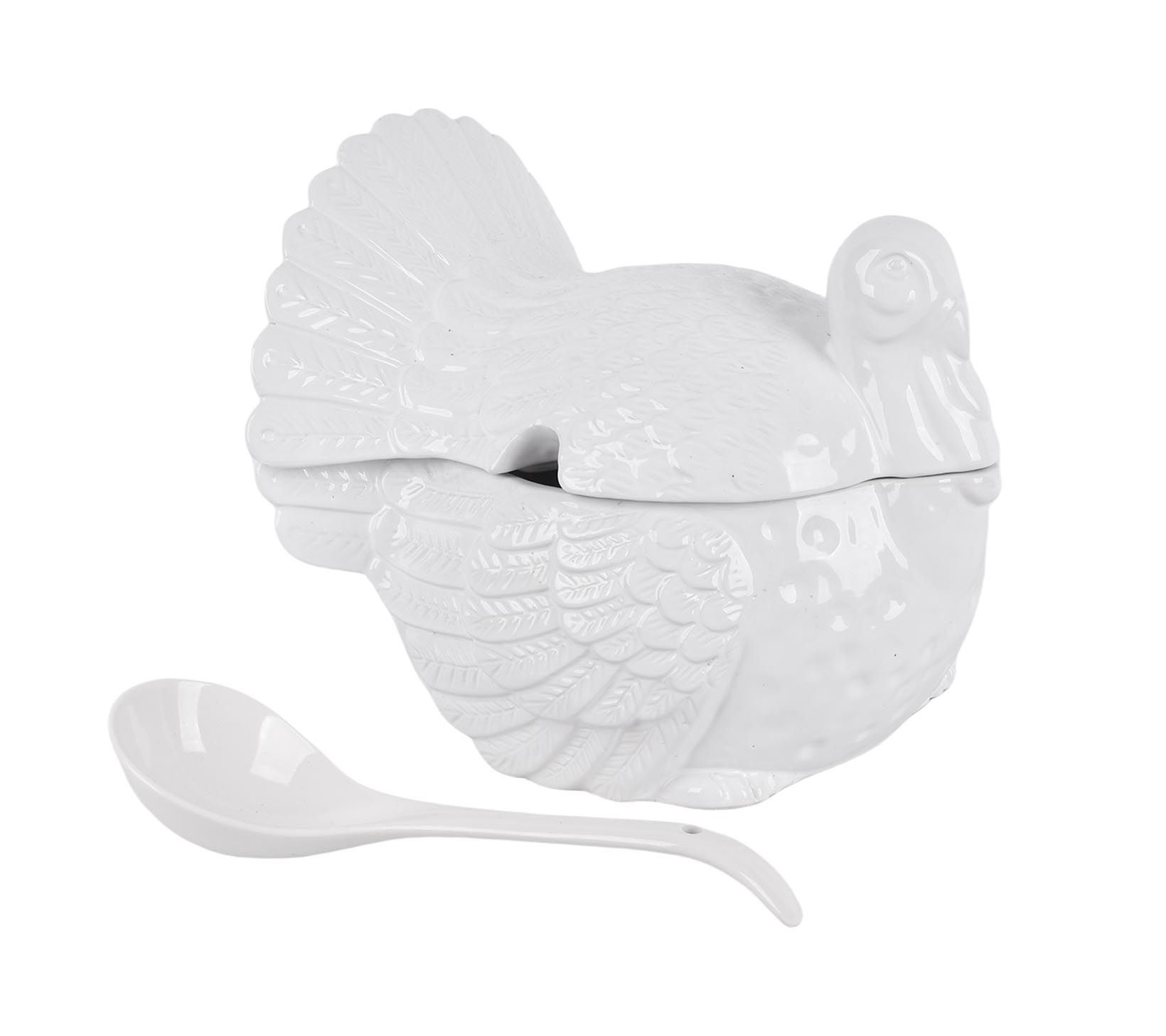 Conversation starter, centerpiece, and soup server, this ceramic tureen will have everyone at the table talking turkey! Complete with lid and ladle, this festive figural server sets you up for a season of fall celebrations. From Temp-tations® Ovenware.