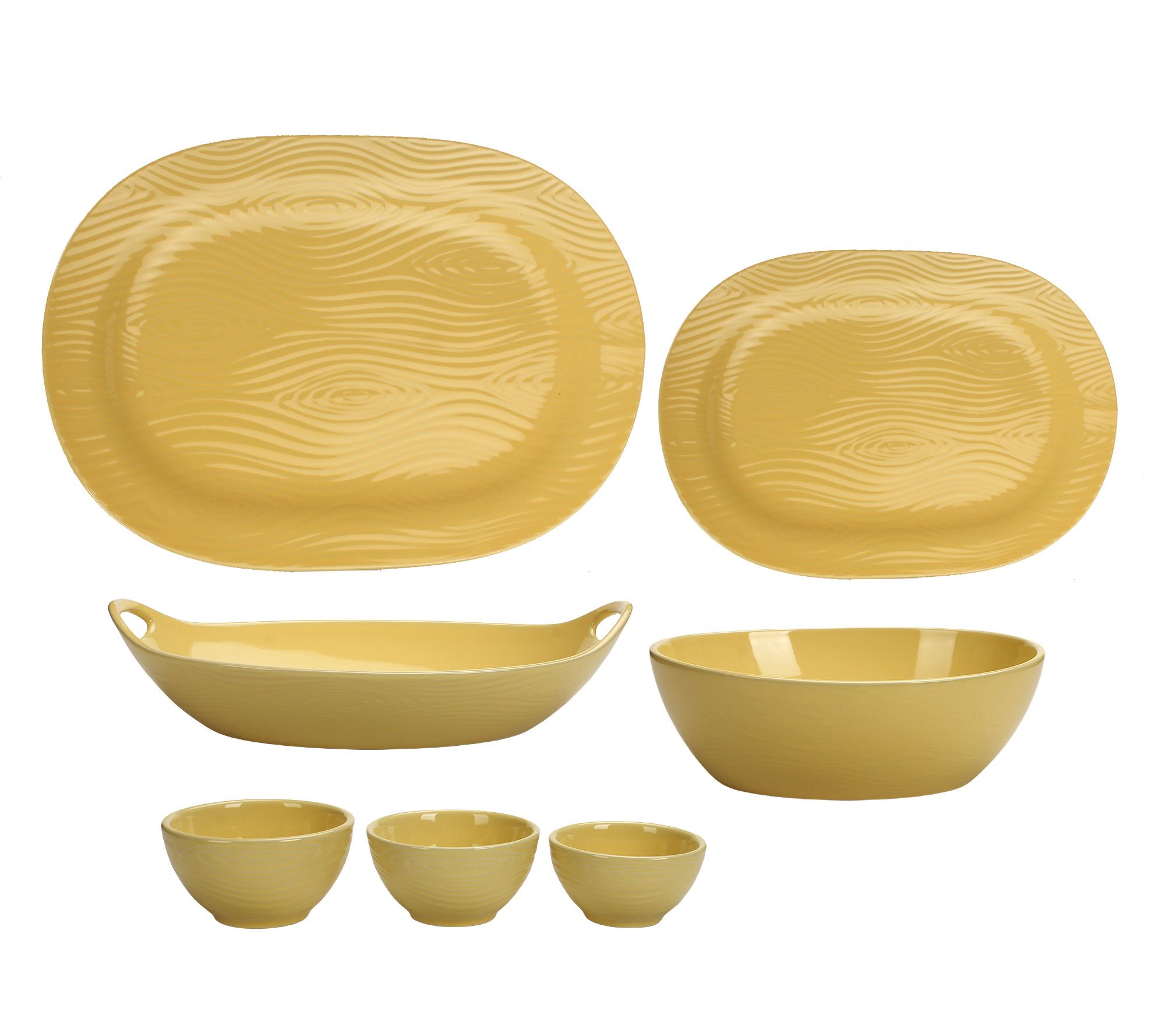 • Includes 18"L platter, 14"L platter, 14"L tray, 2.5-qt oval server, 4-oz dip bowl, 6-oz dip bowl, and 8-oz dip bowl