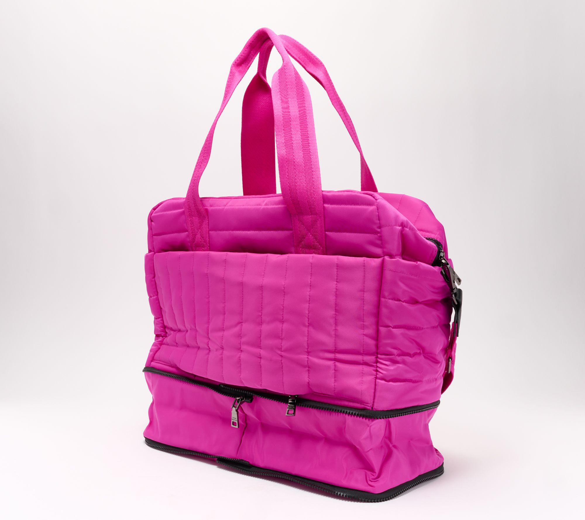 It's Friday night and the weekend is here, so grab this quilted duffle bag and get ready to head out on your next excursion. With pockets on all sides of the exterior, there's plenty of room for your travel essentials. Undo the zipper at the bottom of the bag and watch it extend so you can slip in that extra pair of shoes that just wouldn't fit (because a girl's gotta have options, right?). From Think Royln.