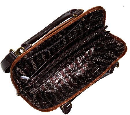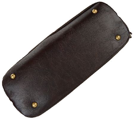 • Double rolled handles, single removable shoulder strap, zip-around top entry, front slip pocket, back slip pocket, antiqued brasstone hardware, bottom feet