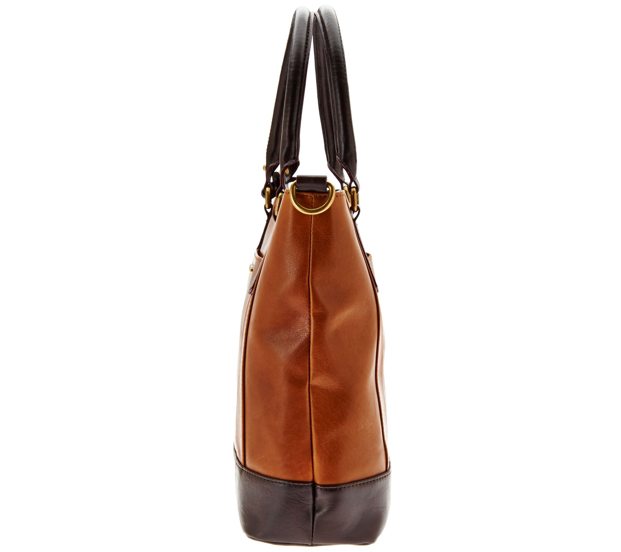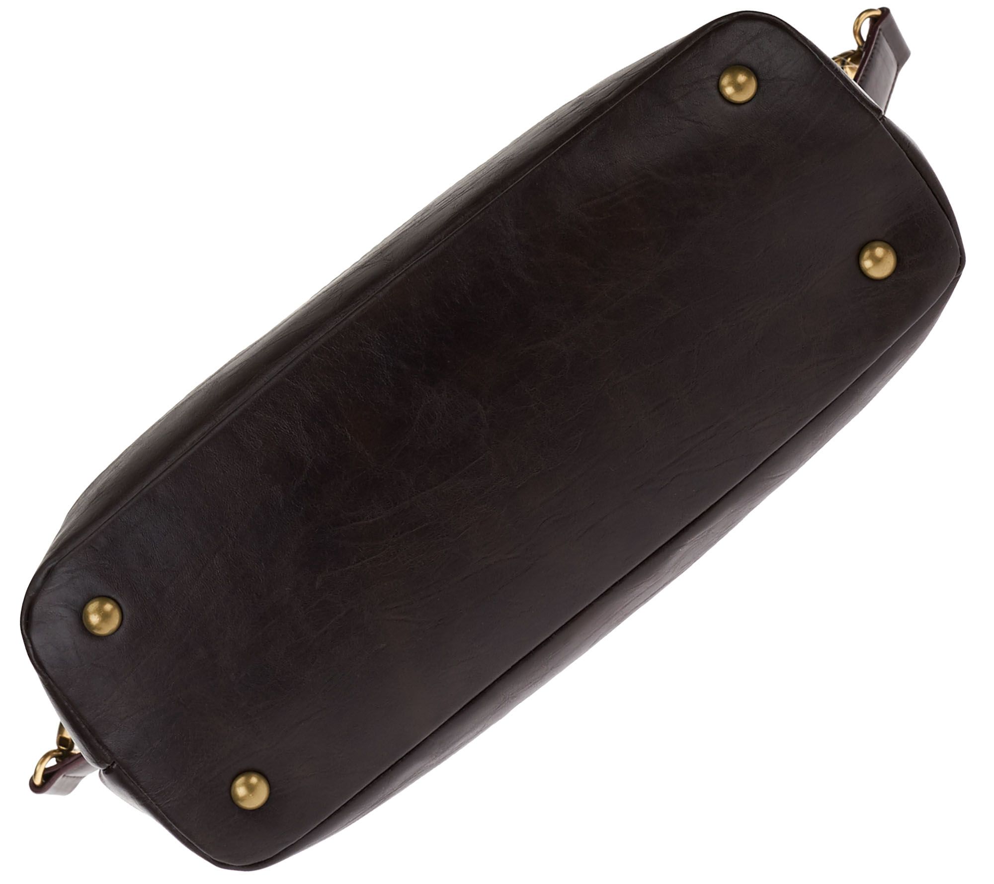 • Glazed vintage leather, double rolled handles, fully detachable shoulder strap, bridge with magnetic snap closure, antiqued brasstone hardware, front slip pocket, back slip pocket, bottom feet