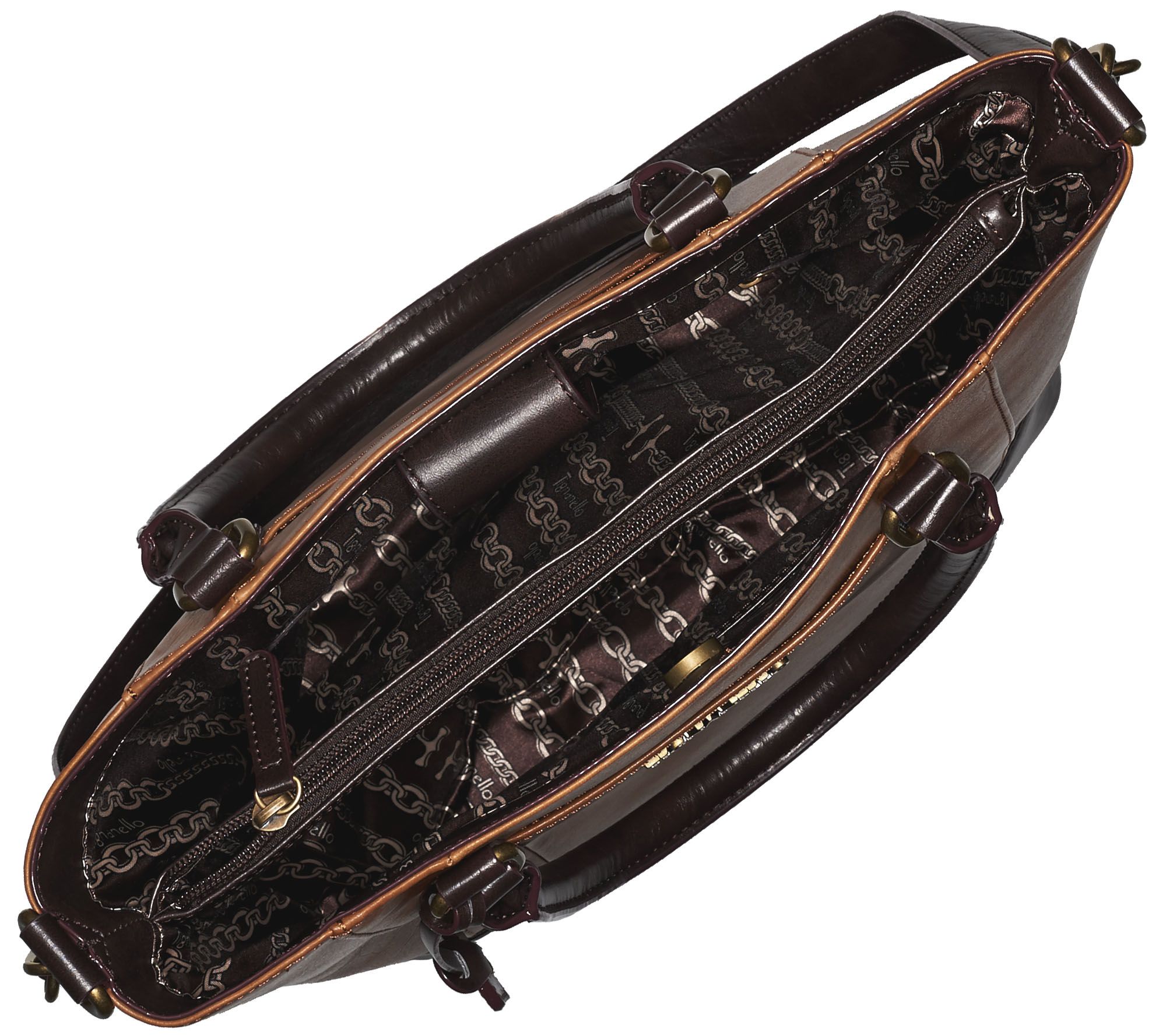 • Printed lining, two front-wall slip pockets, one back-wall zip pocket, center wall with top zipper closure