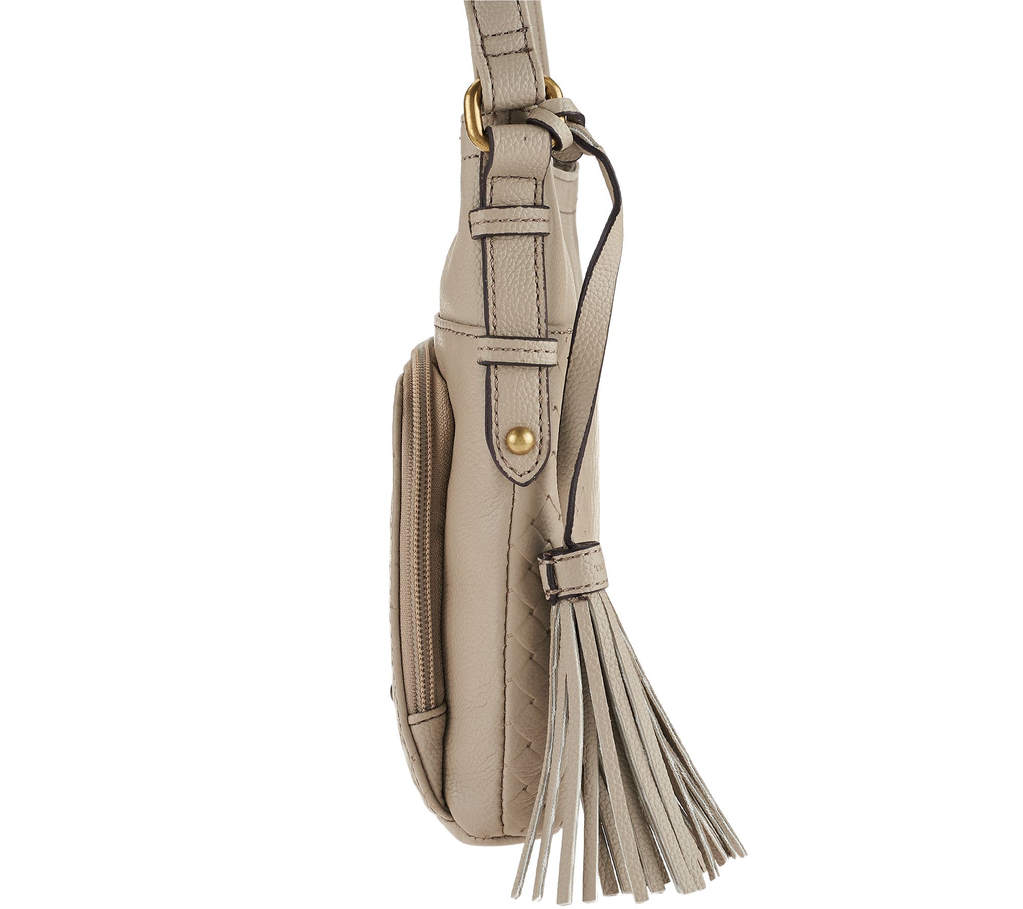 • Pebble leather body; adjustable crossbody strap with buckle; top zip closure; antiqued brasstone hardware; front pocket with magnetic snap closure; back zip pocket with six card slots, two slip pockets, and back-wall zip pocket