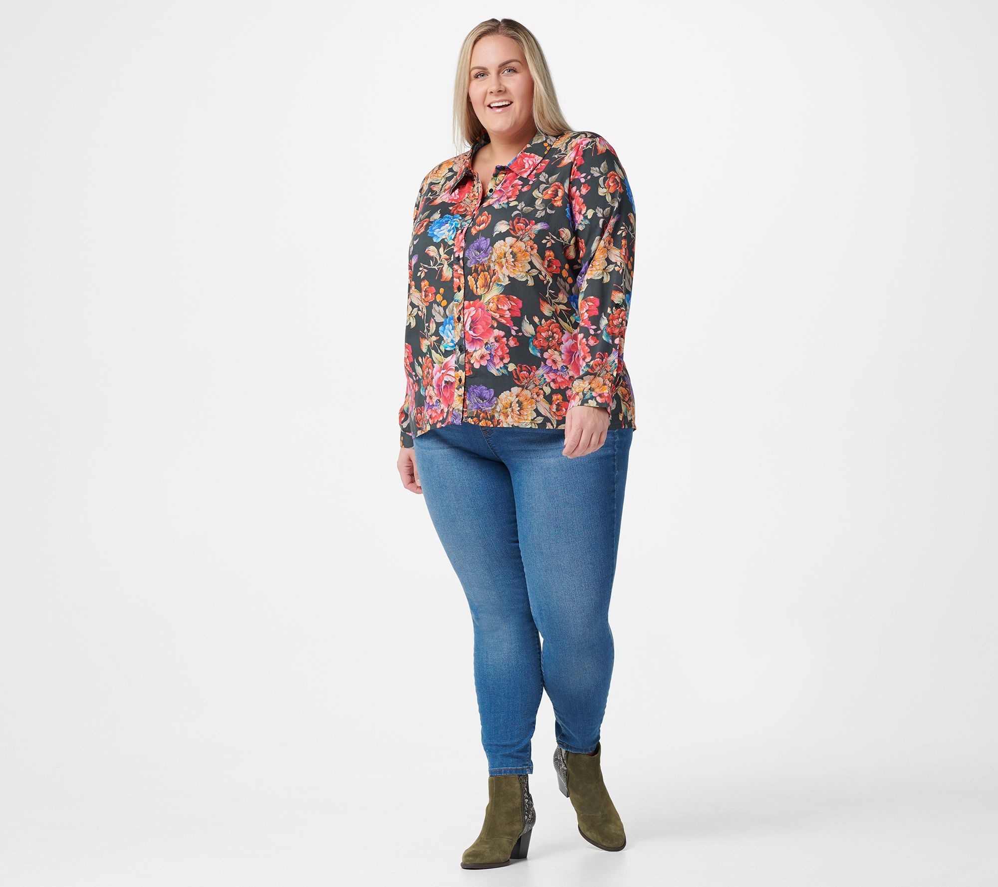 • Features: button-down front, collared neckline, long sleeves with roll-tab, allover print