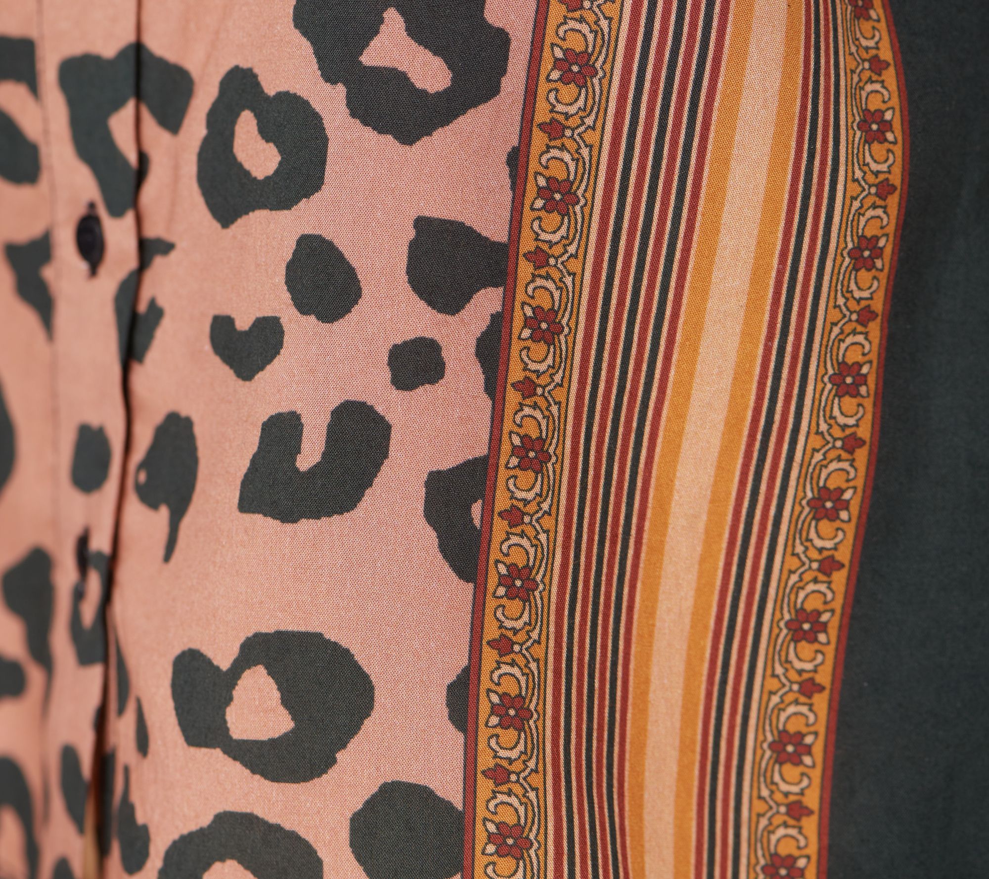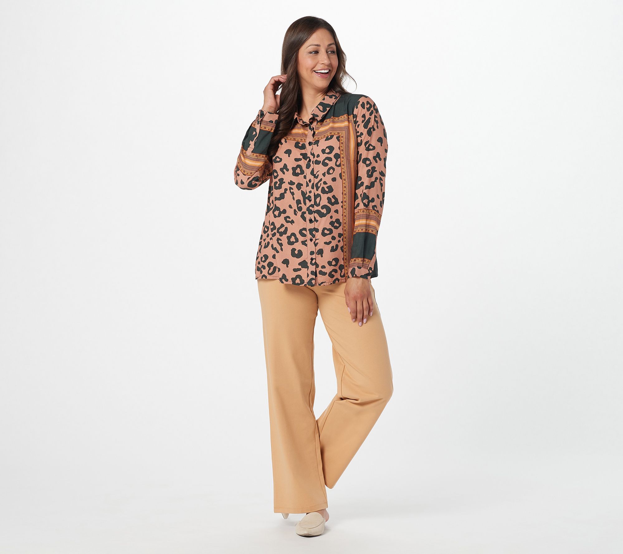 A bold mix of animal and abstract patterns makes this button-down blouse truly stand out. From the Tolani Collection.