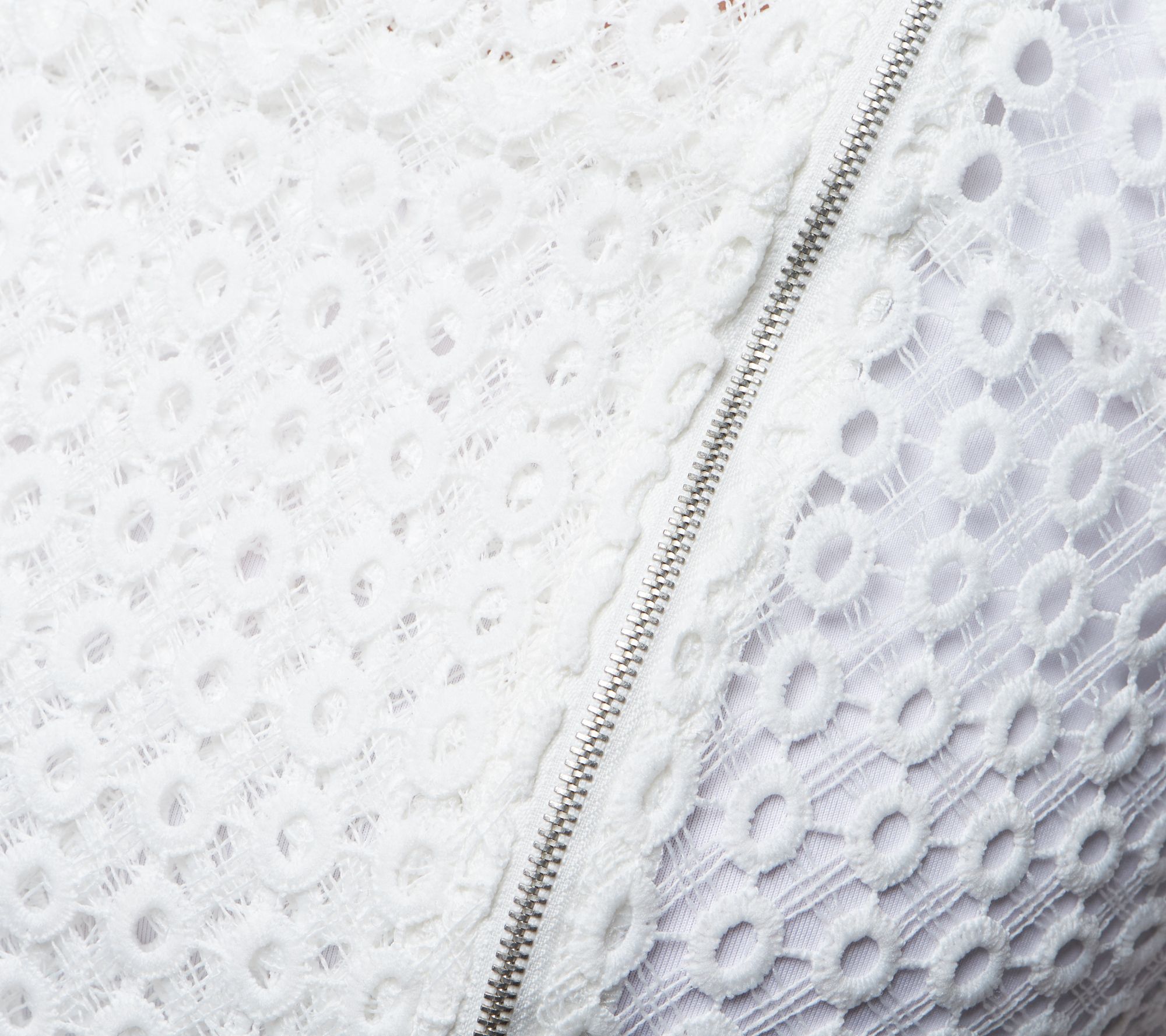 Shake things up with this moto-style jacket featuring a see-through eyelet design and flouncy trim that exudes ladylike appeal. From Truth + Style.