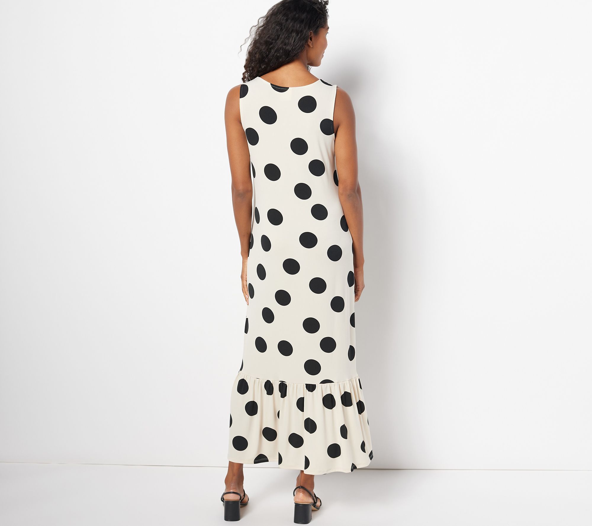 • Features: printed, matte jersey, sleeveless, ruffle bottom, midi style