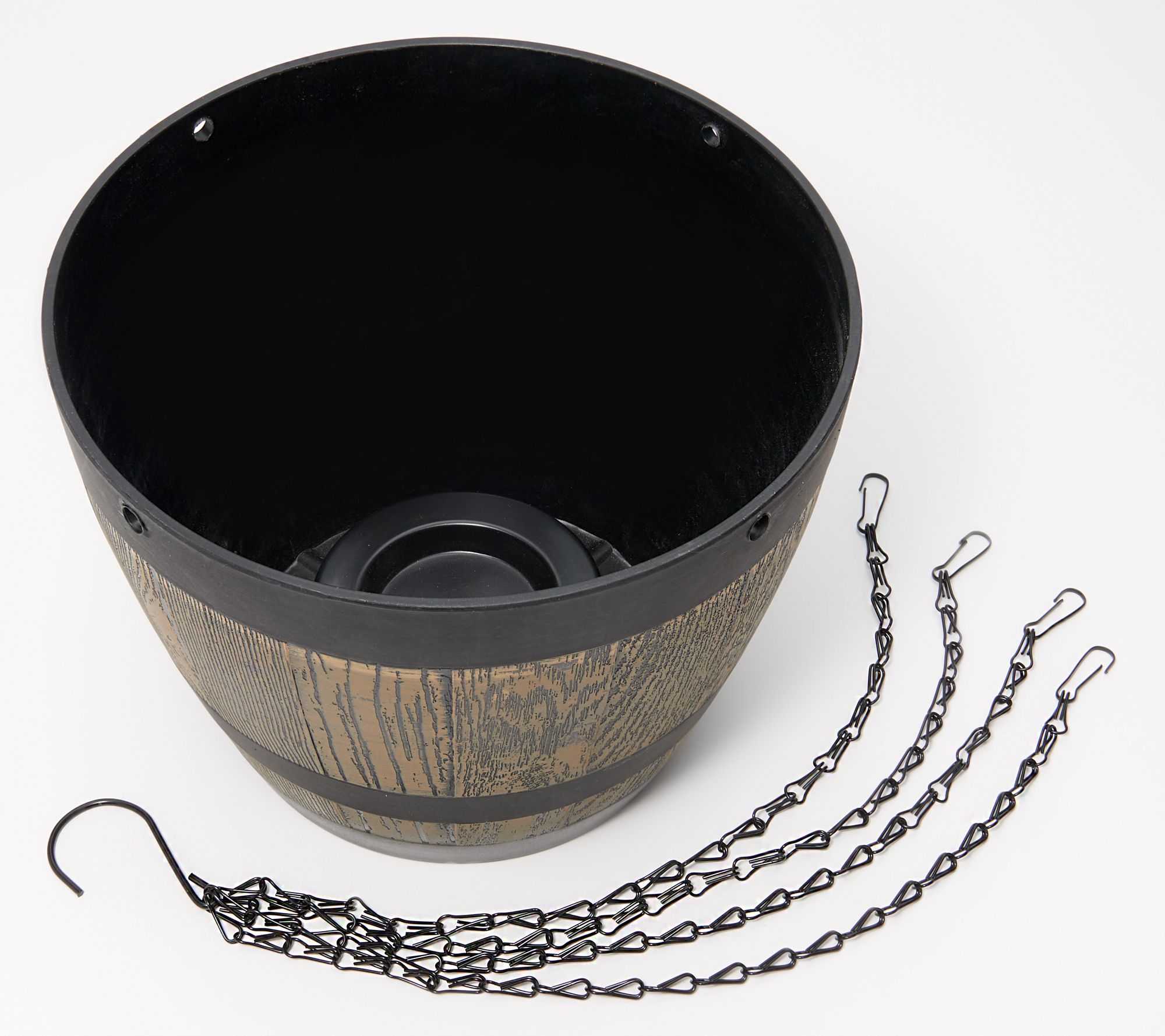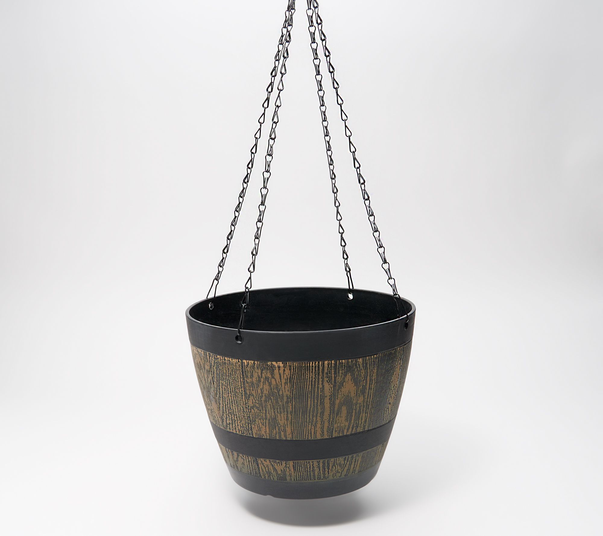 Elevate your plants and flowers in this hanging whiskey barrel planter. The faux wood finish pairs beautifully with all seasonal greenery. From Ultimate Innovations.