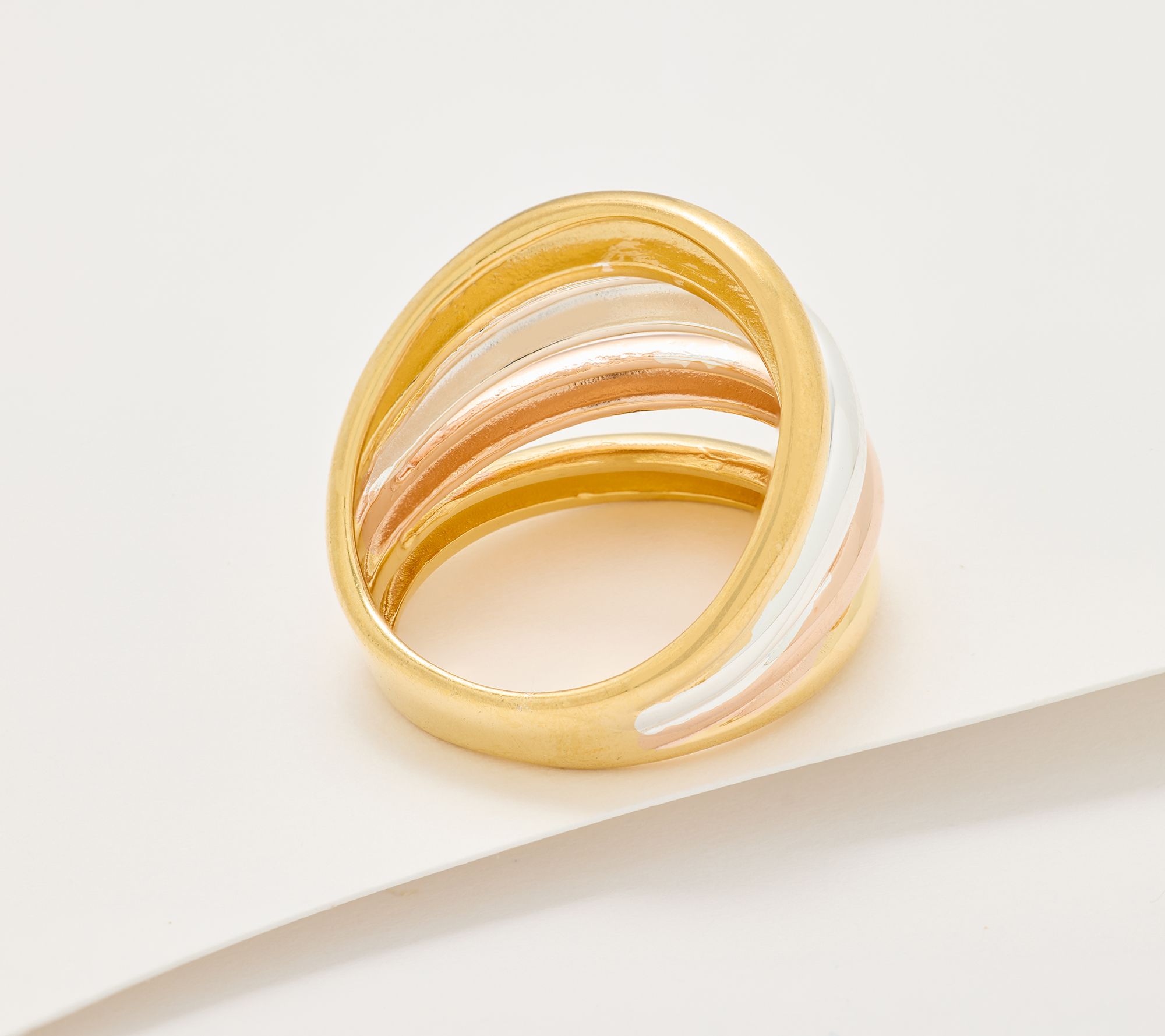 From the Ultrafine Silver Collection comes this graduated, bold layered ring in polished finish. Choice of colorways: Silver or 18KT Yellow gold or Tri-Color (silver, 18kt yellow and rose gold) plated Silver. Available in sizes: 4, 5, 6, 7, 8, 9, 10 and 11. Approximate measurements are 3/4"L x 3/4"W. Made in Italy. "As Is" Item See J454302