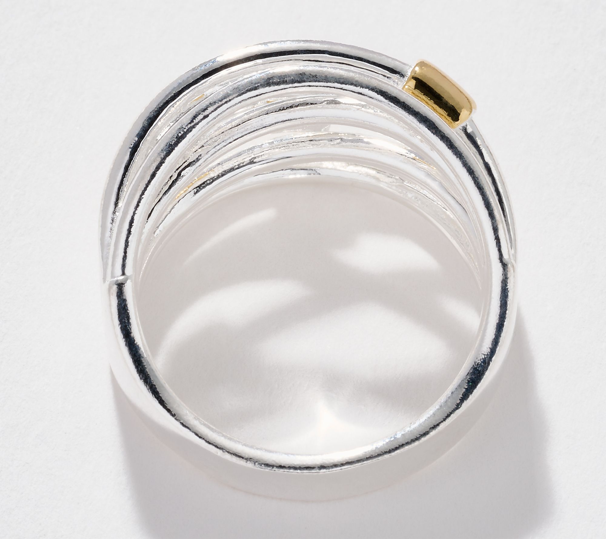 Contemporary artwork or conversation piece? Yes and yes! This stunning crossover ring, featuring a multi-band design with eye-catching cylindrical stations, will inspire compliments and delightful discussions every time it is worn. From UltraFine® 950 Silver Nickel-Free Jewelry.