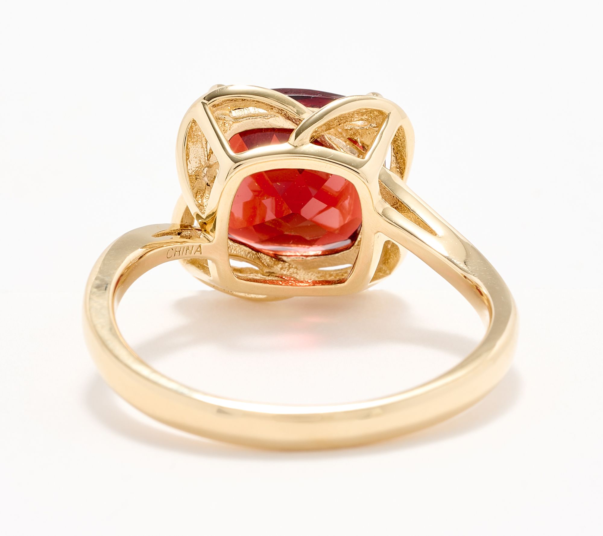 • Large, cushion-cut garnet; prong setting; polished finish