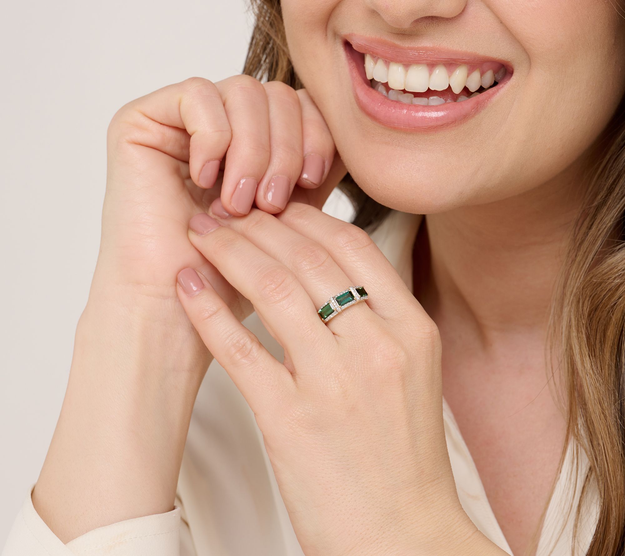 • Three rectangular step-cut, prong-set green tourmaline gemstones; round, prong-set, white diamonds with rhodium plating; polished finish