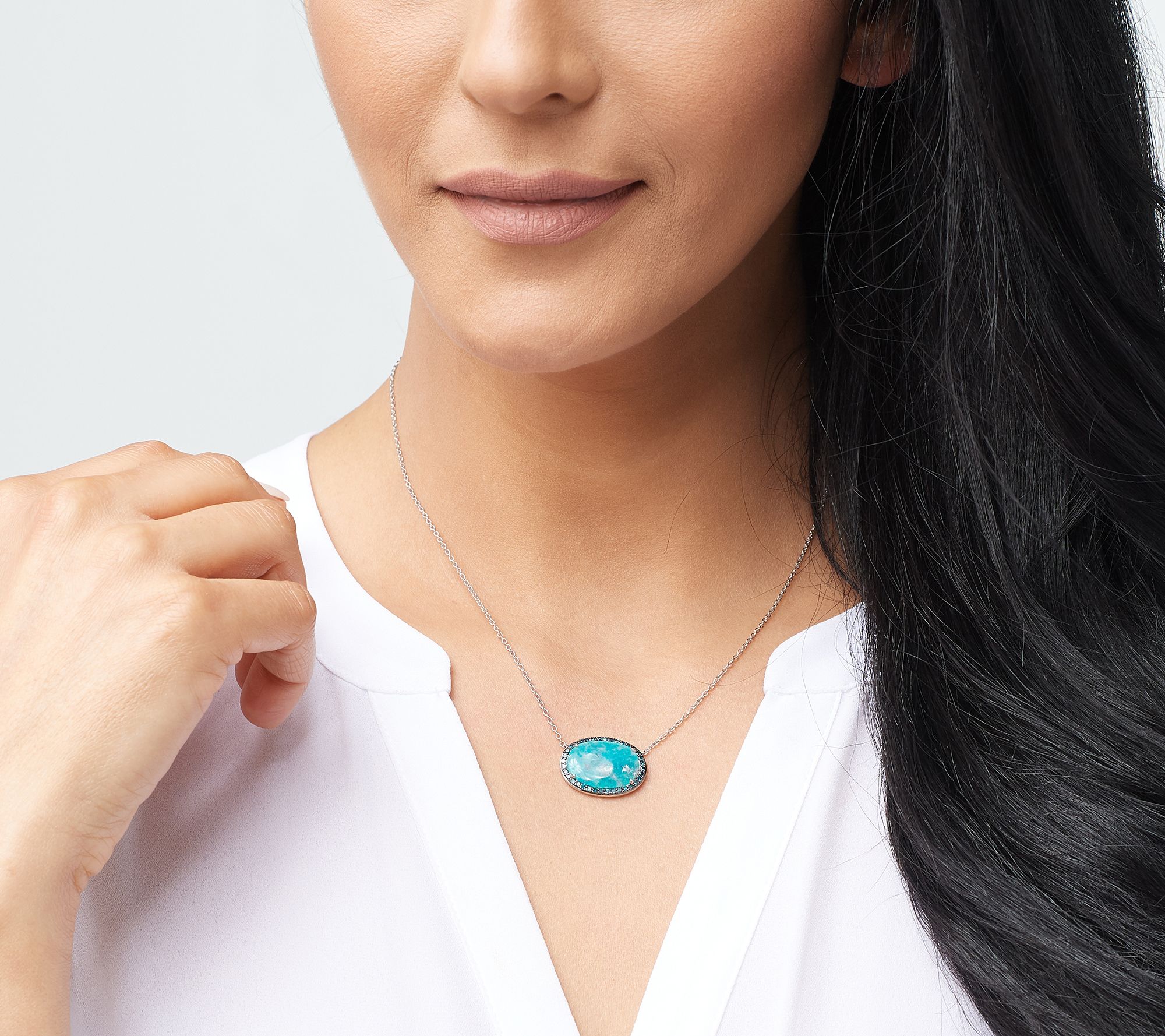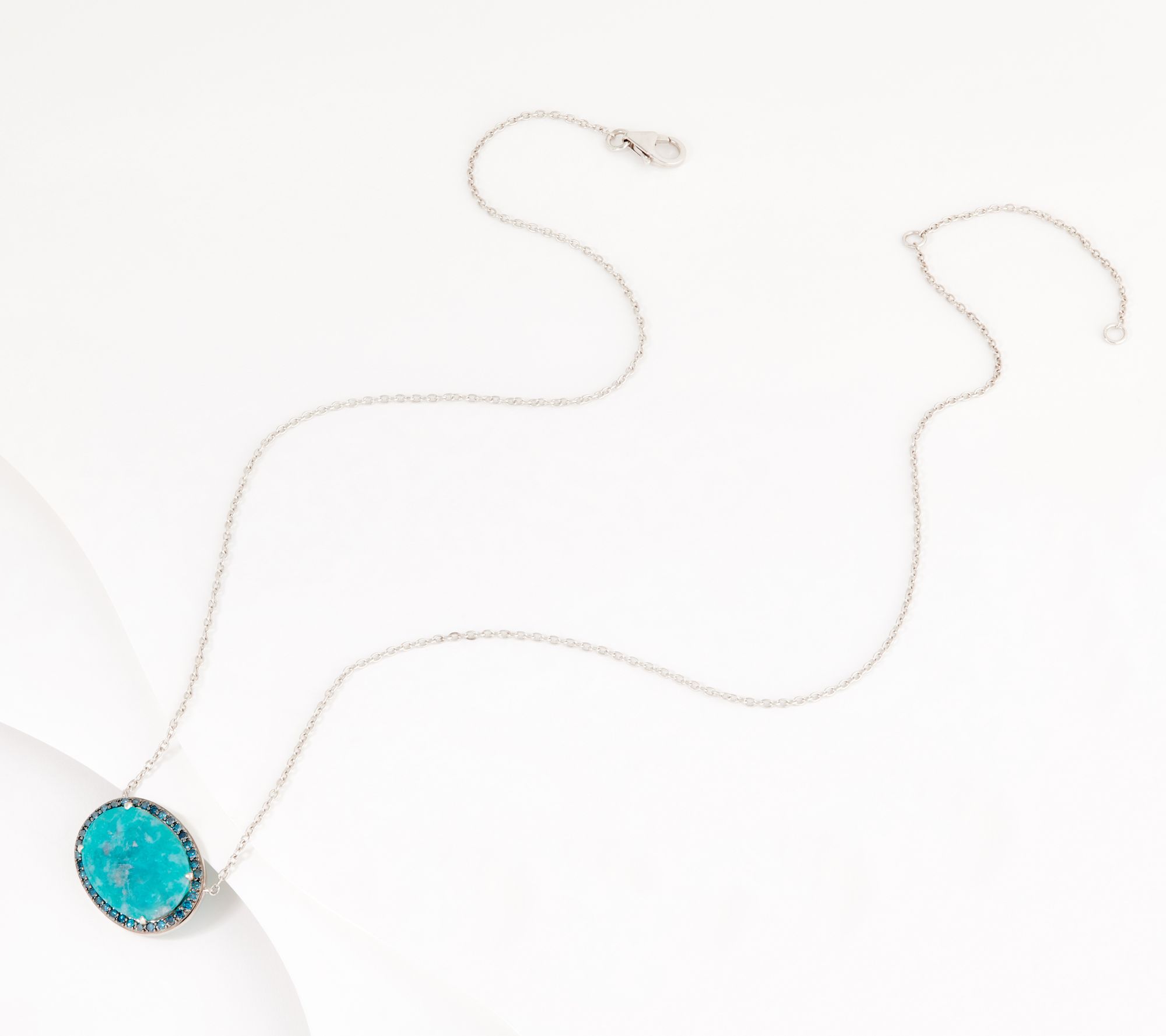 • Sparkle cable chain; oval-cut Paraiba tourmaline cabochon slice in prong set in east/west design; halo of round, single-cut natural blue diamonds; rhodium plating; polished finish