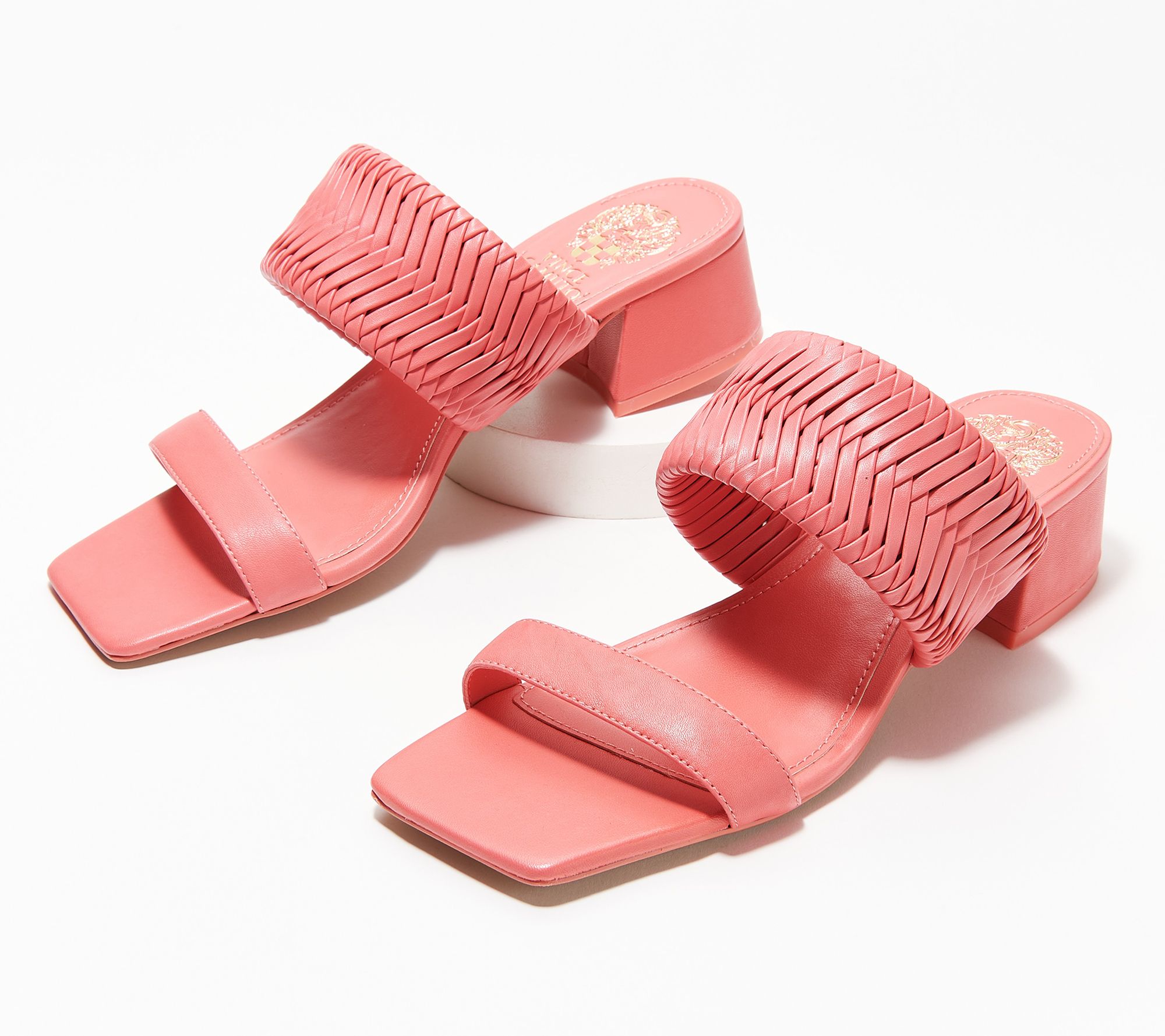 Meet Shamira. This double-banded slip-on sandal features a woven detail and modern square toe that pairs perfectly with side-zip leather pants for a stylish day out. From Vince Camuto.