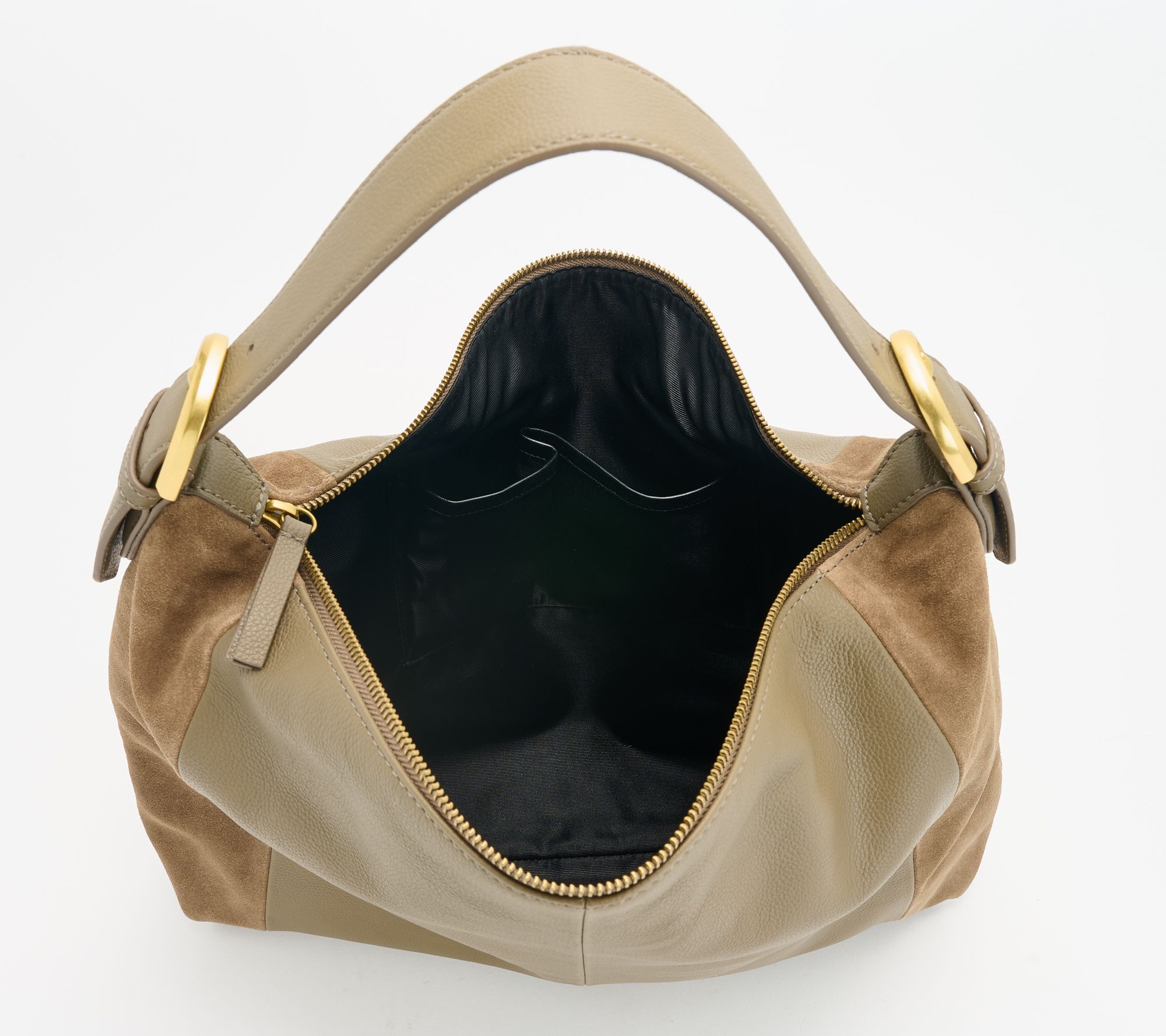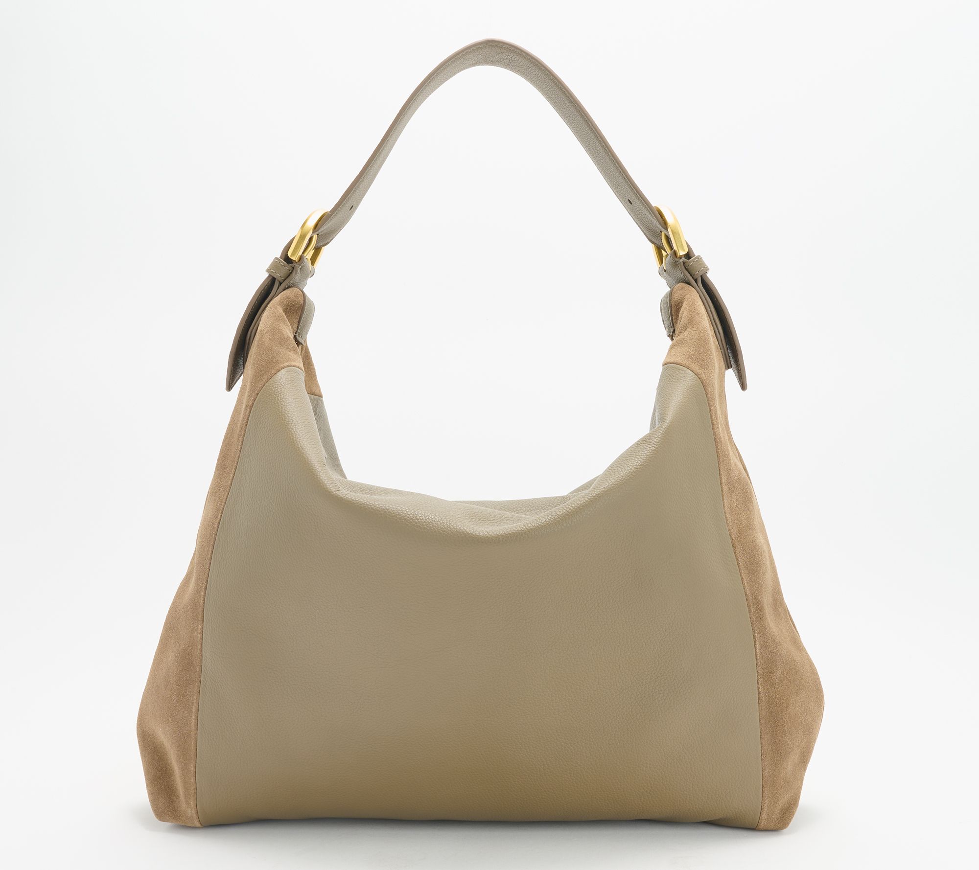 • Pebbled leather and suede, goldtone buckle accents, shoulder strap, zippered closure