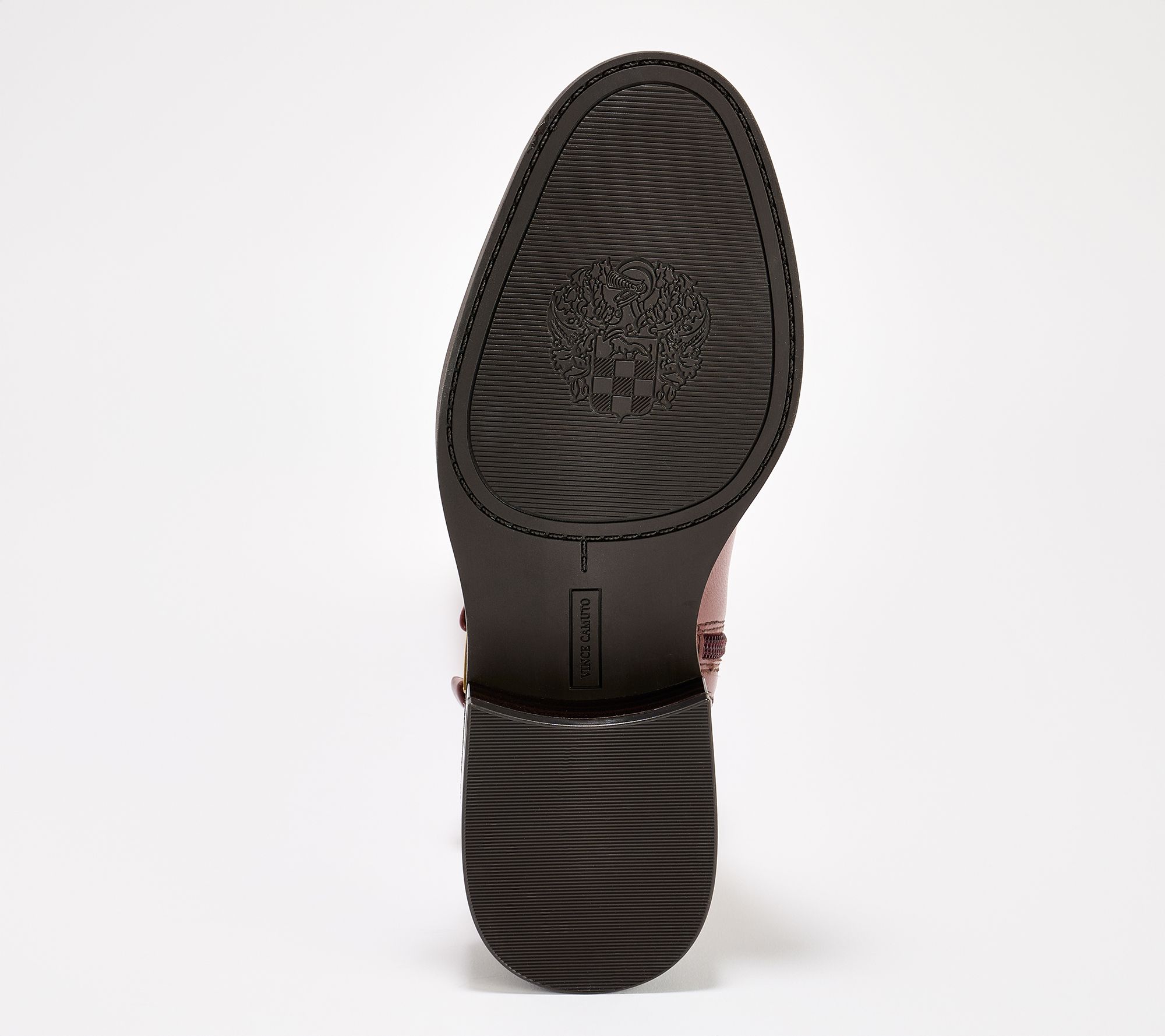 • Water-resistant smooth leather or suede upper, back stretch gore panel, inside zipper closure, strap with hardware detail, antiqued goldtone hardware, rounded toe
