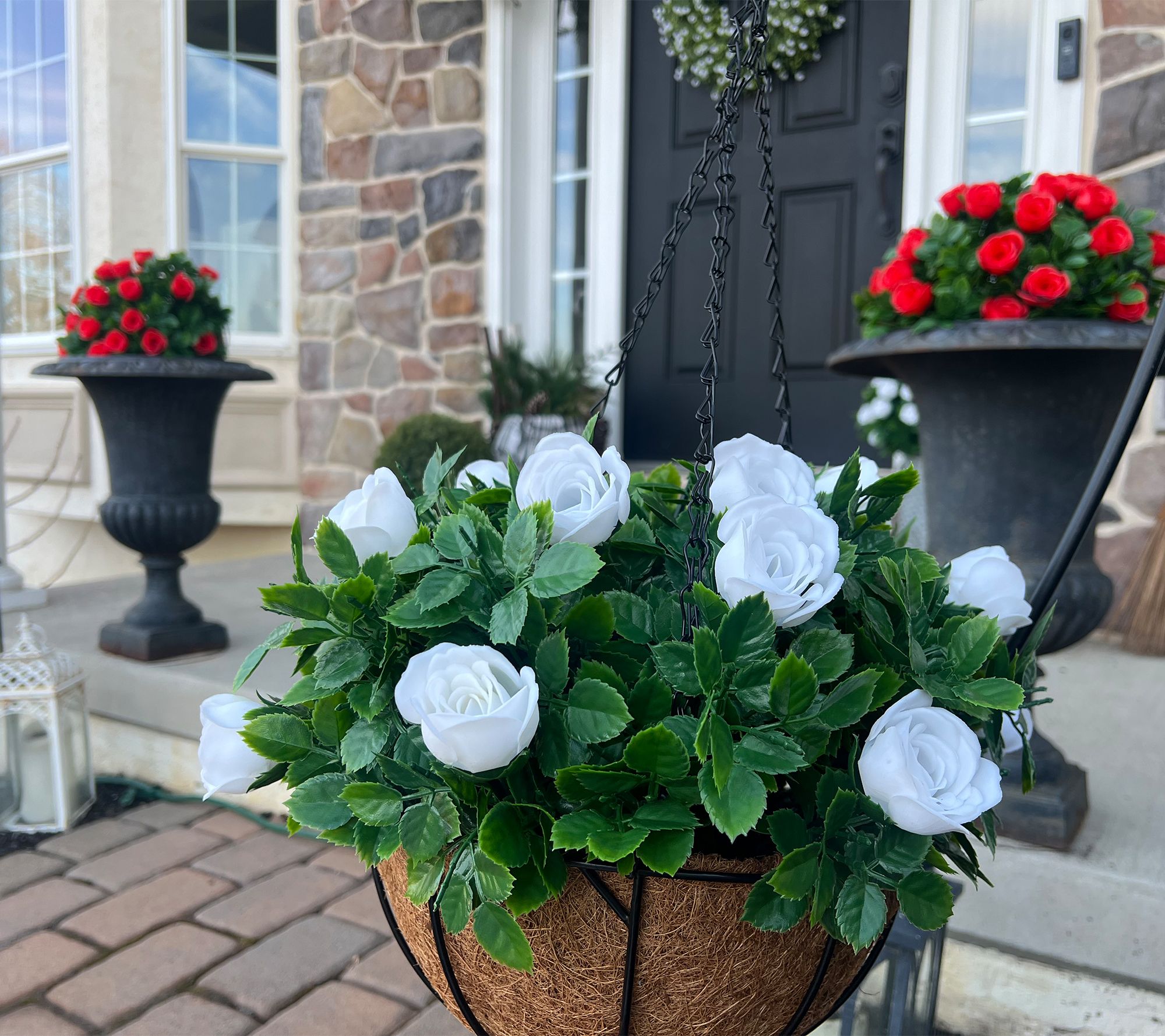 • Includes lifelike roses and greens in hanging basket with removable chain