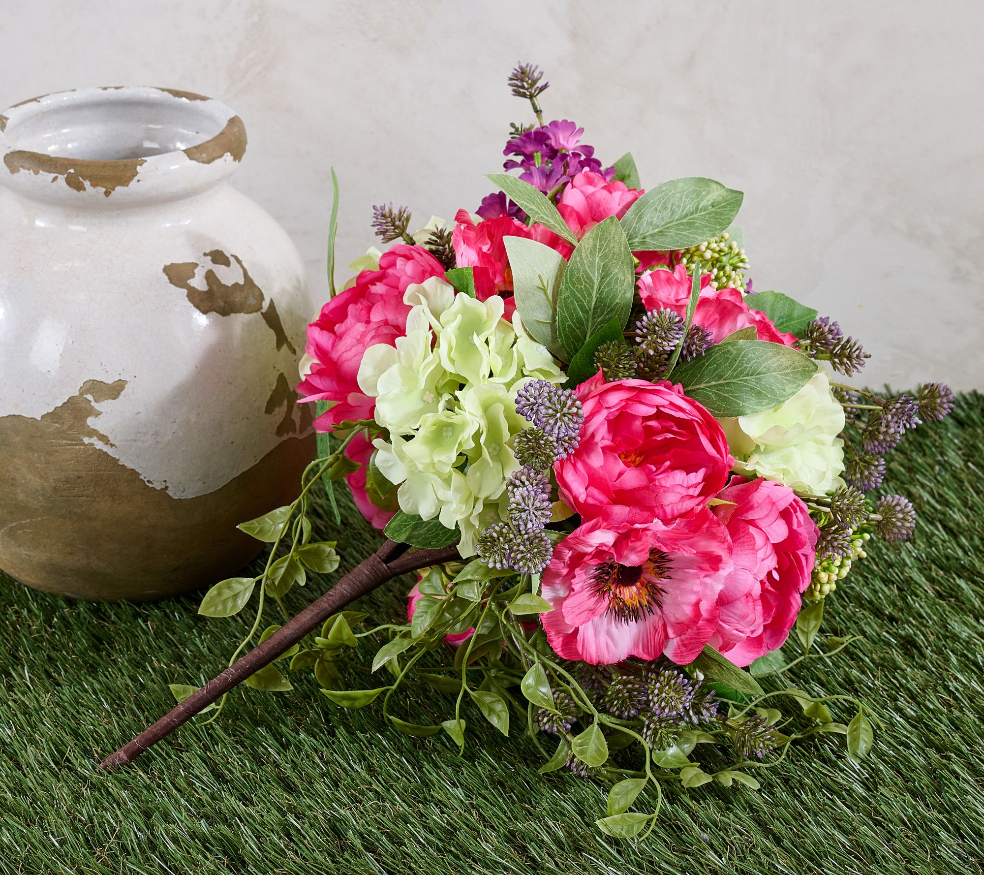 • Mixed lifelike floral arrangement with greens, urn not included